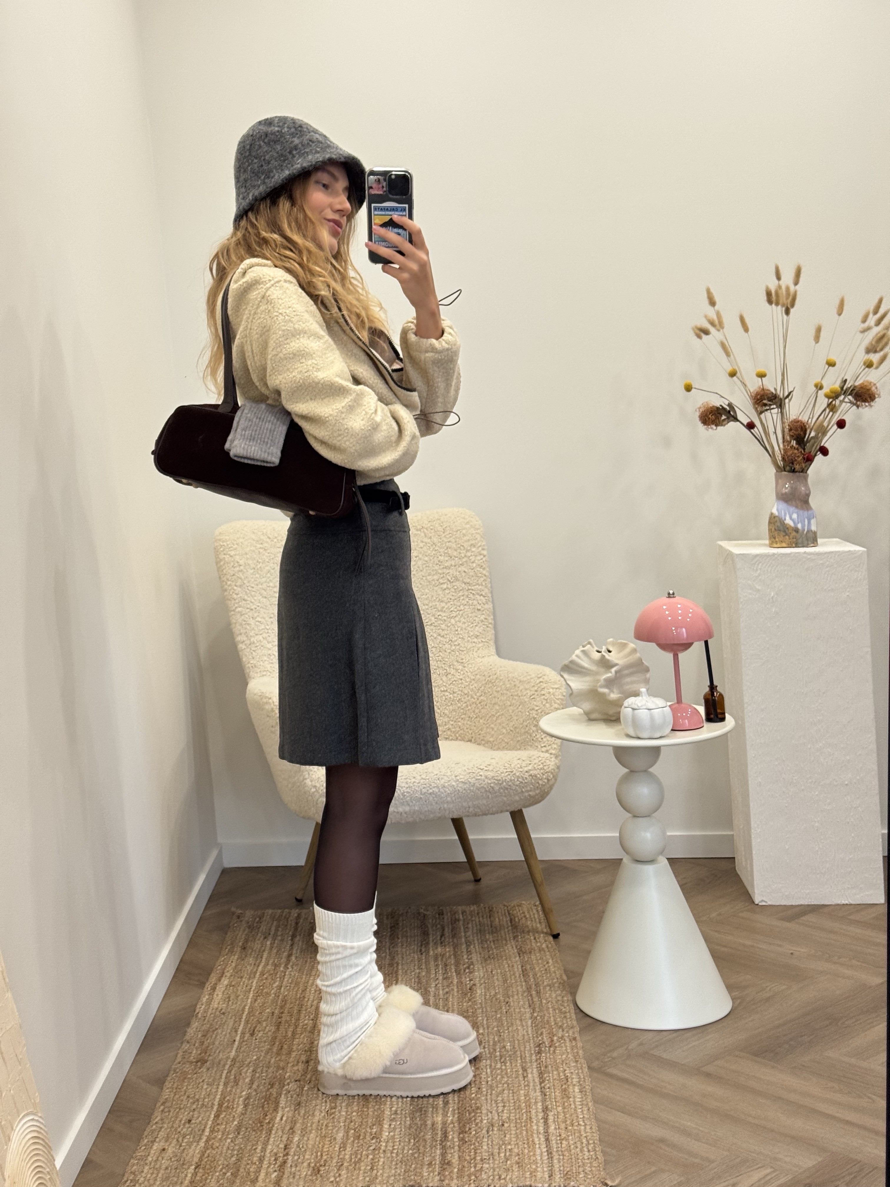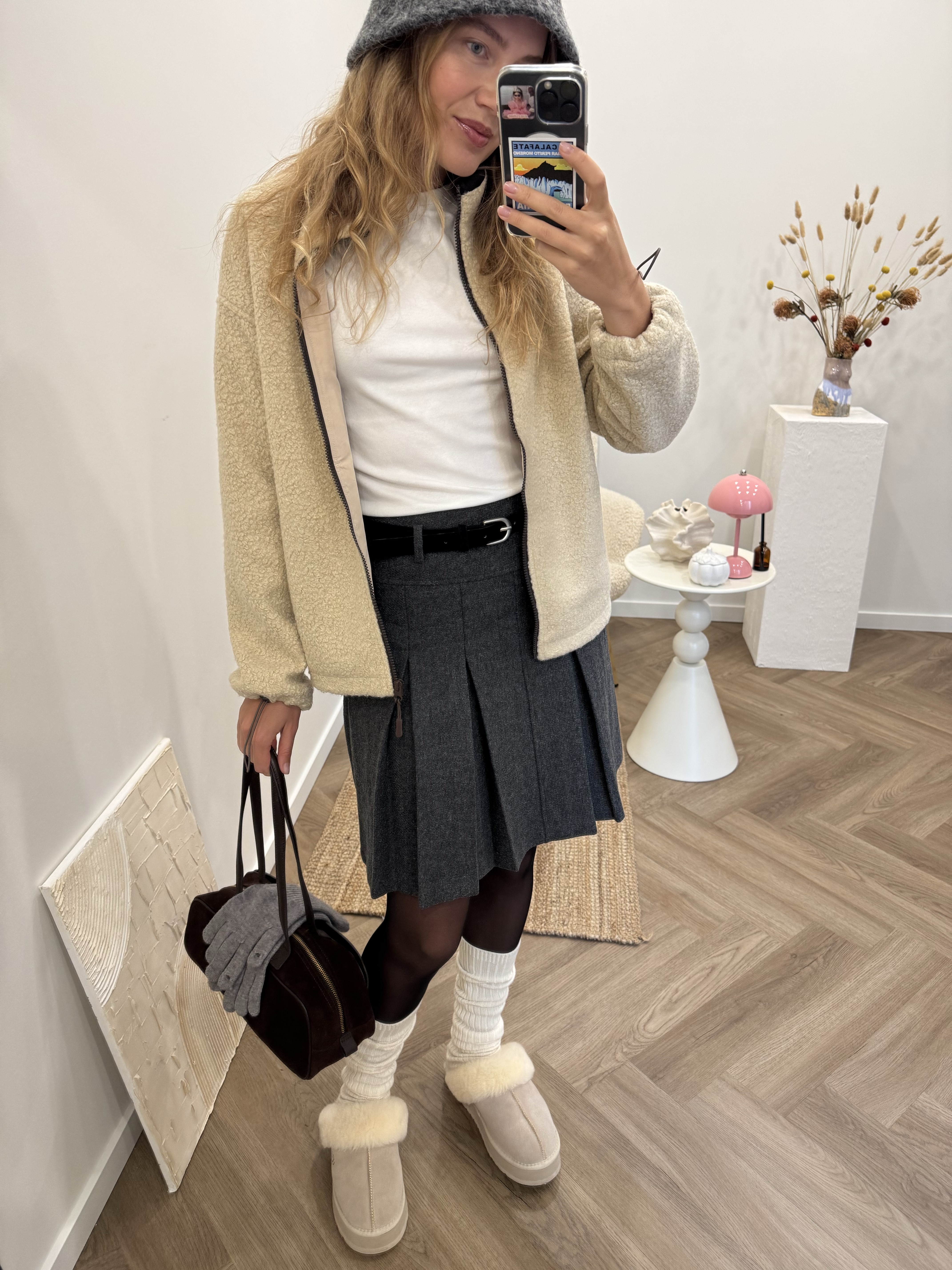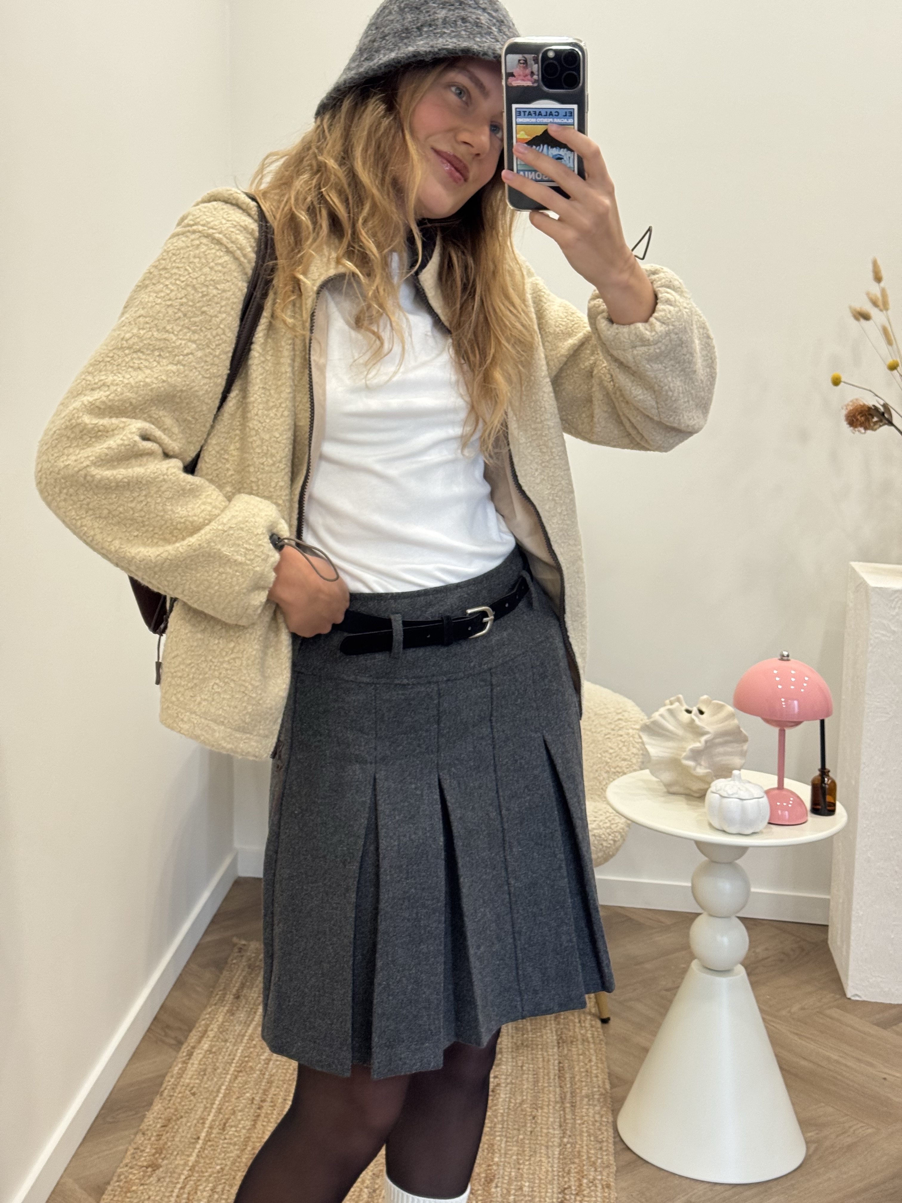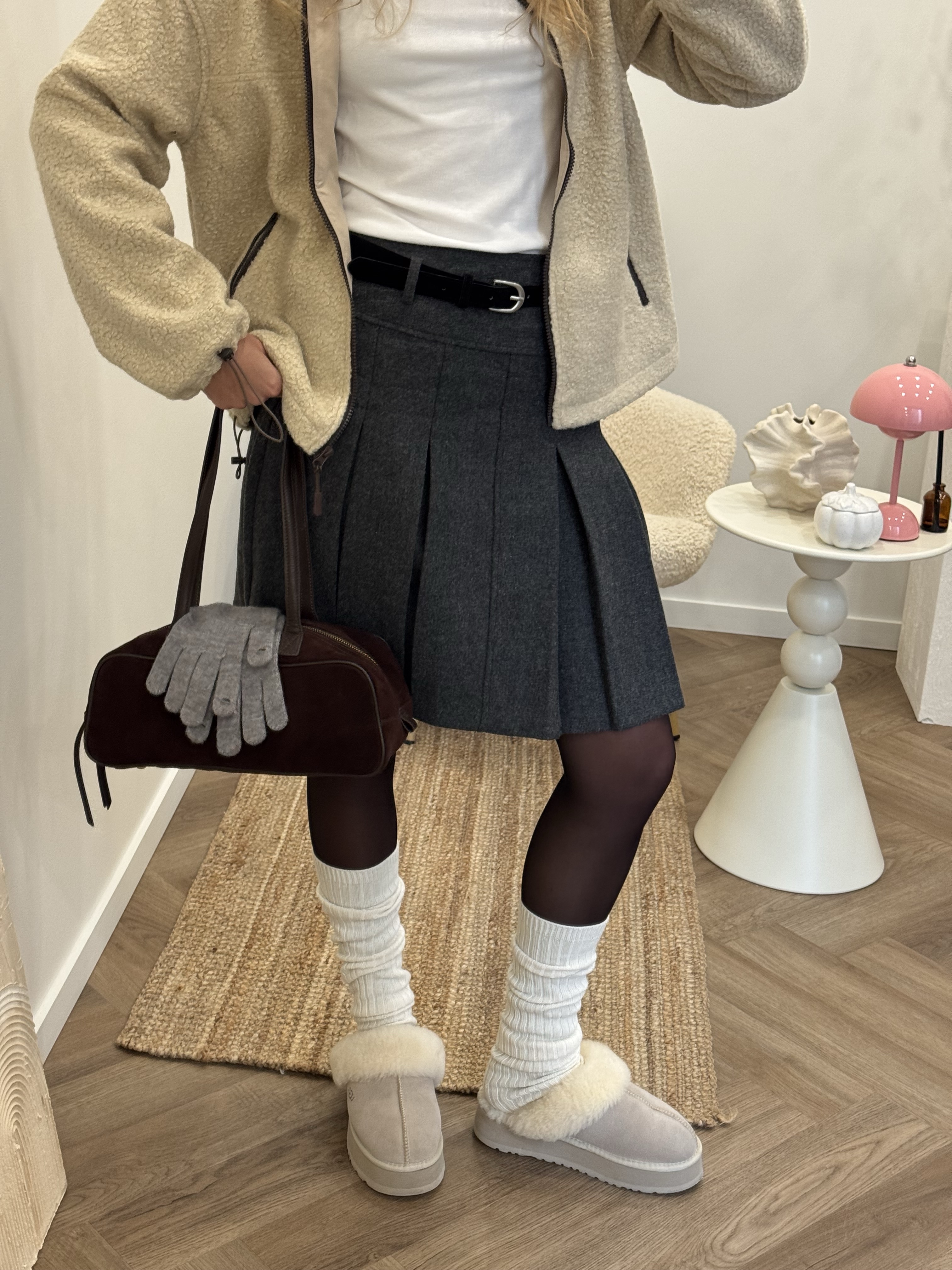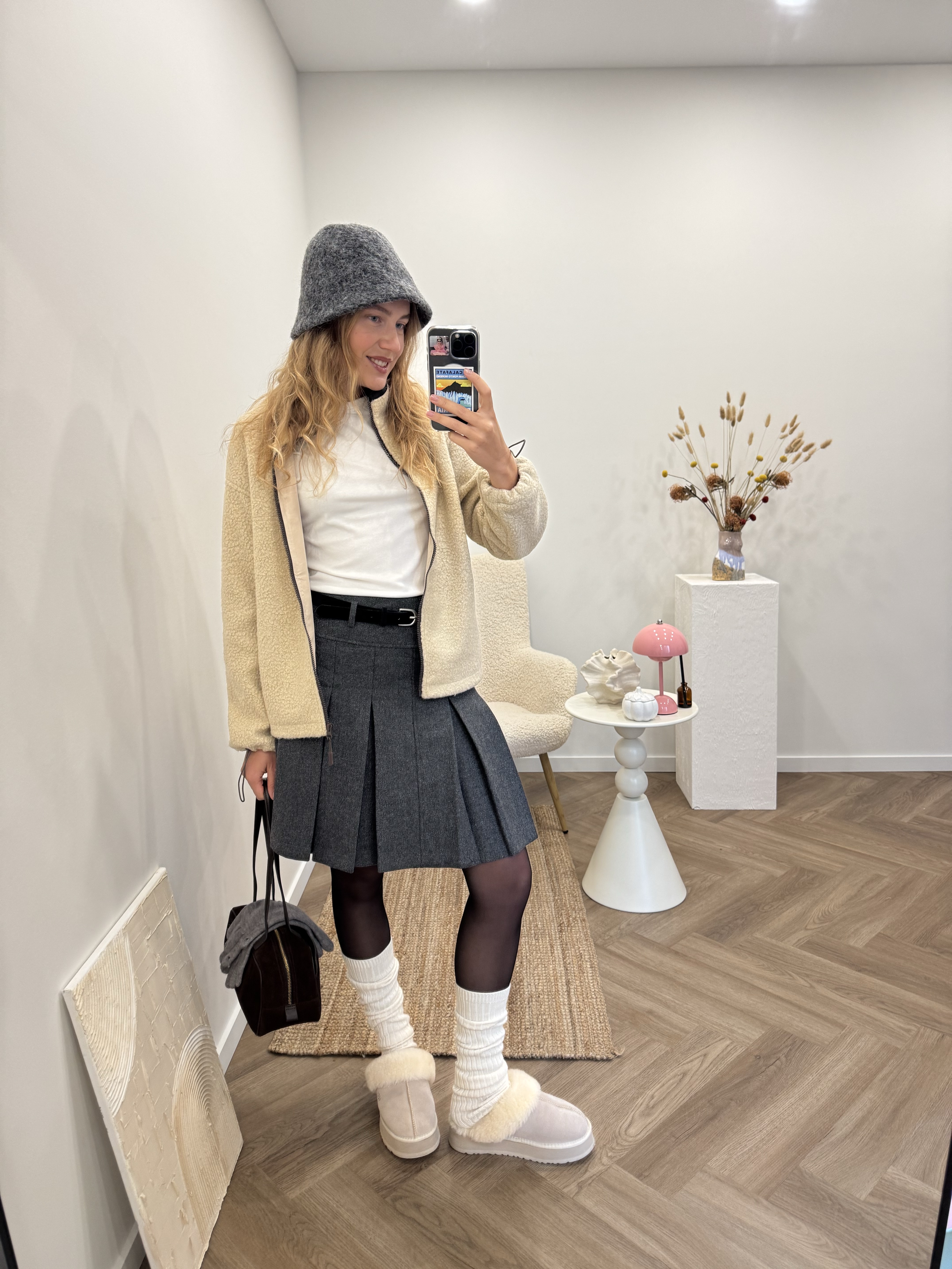 Юбка из тёплой шерстяной ткани с мягкой фактурой и удобной посадкой на талии. Глубокие встречные складки создают аккуратный объём и красиво двигаются при ходьбе. Благодаря плотному материалу модель отлично подходит для зимнего сезона — она сохраняет тепло и при этом выглядит элегантно. Идеальна для образов с уютными свитерами, гольфами, лонгсливами и тёплыми ботинками.