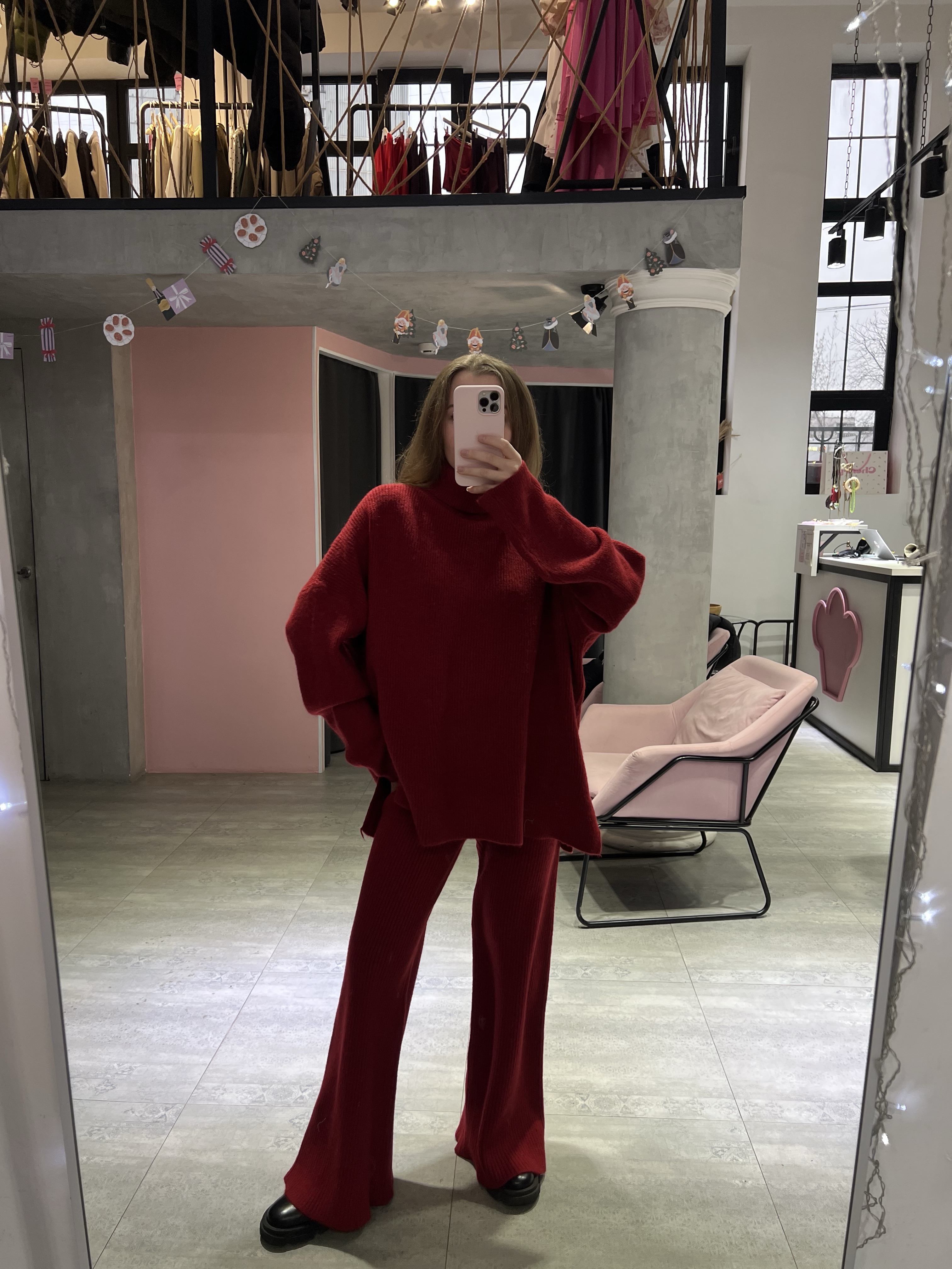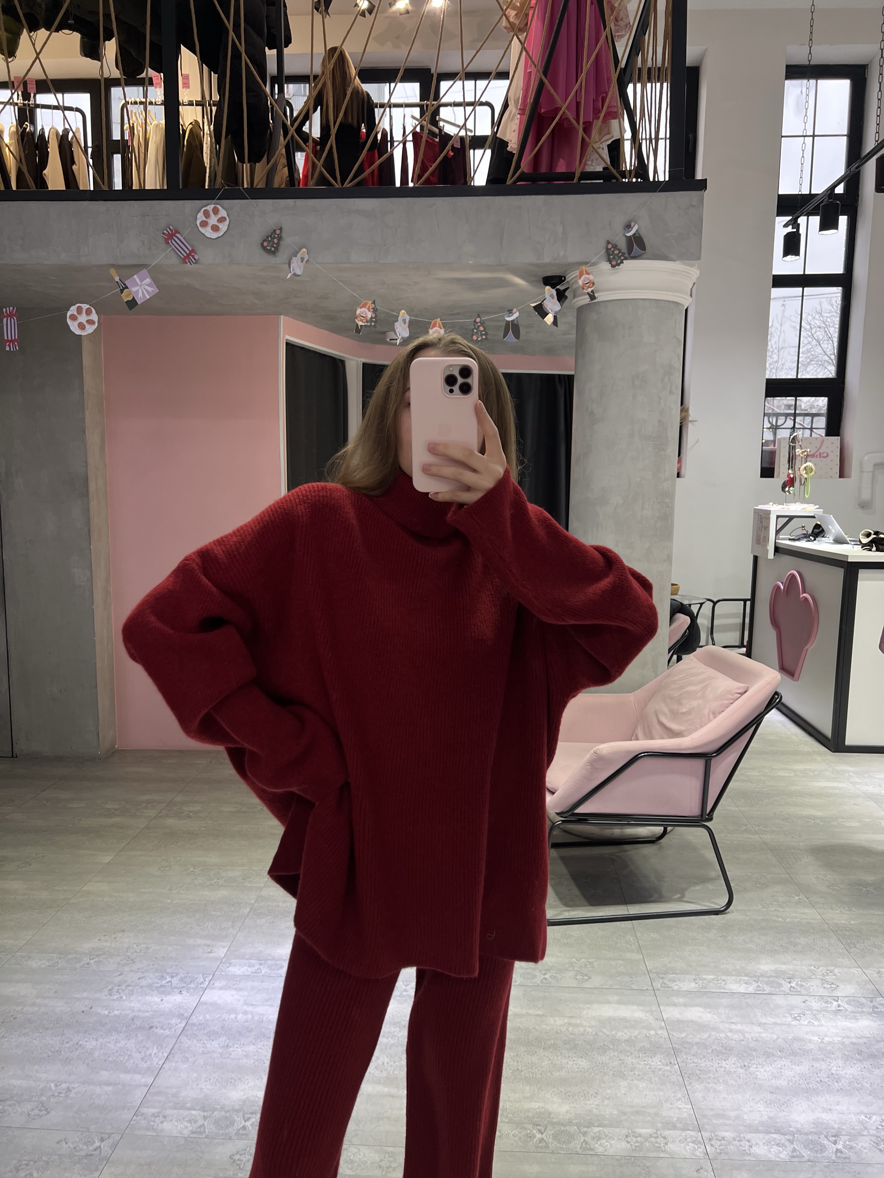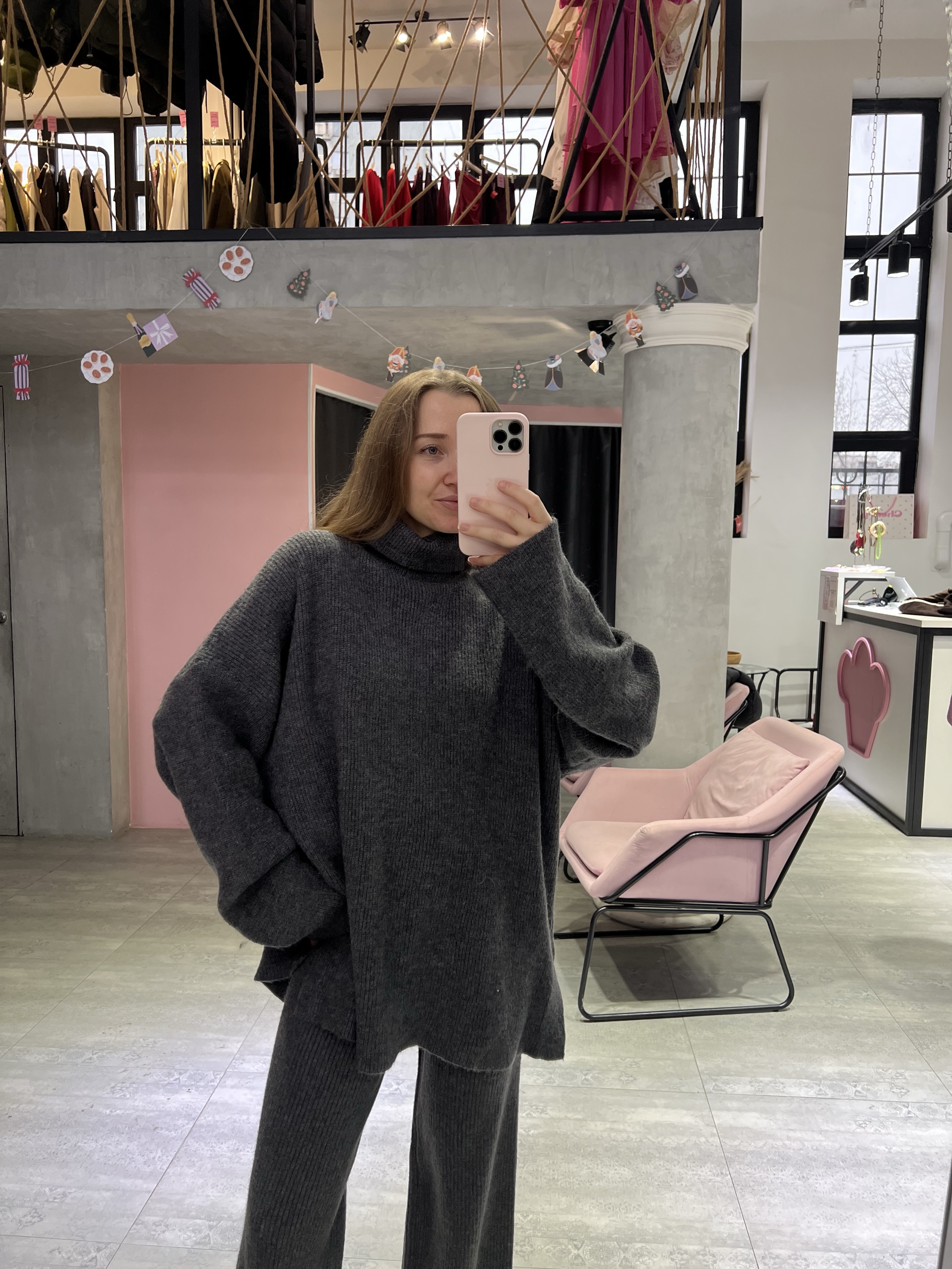 Этот шерстяной костюм — про спокойную уверенность и продуманный комфорт на каждый день. Свитер оверсайз с высоким горлом мягко окутывает и держит тепло, создавая расслабленный, но собранный силуэт. Фактура смотрится благородно и аккуратно, без лишней строгости — тот самый баланс, который легко вписывается в повседневную жизнь.