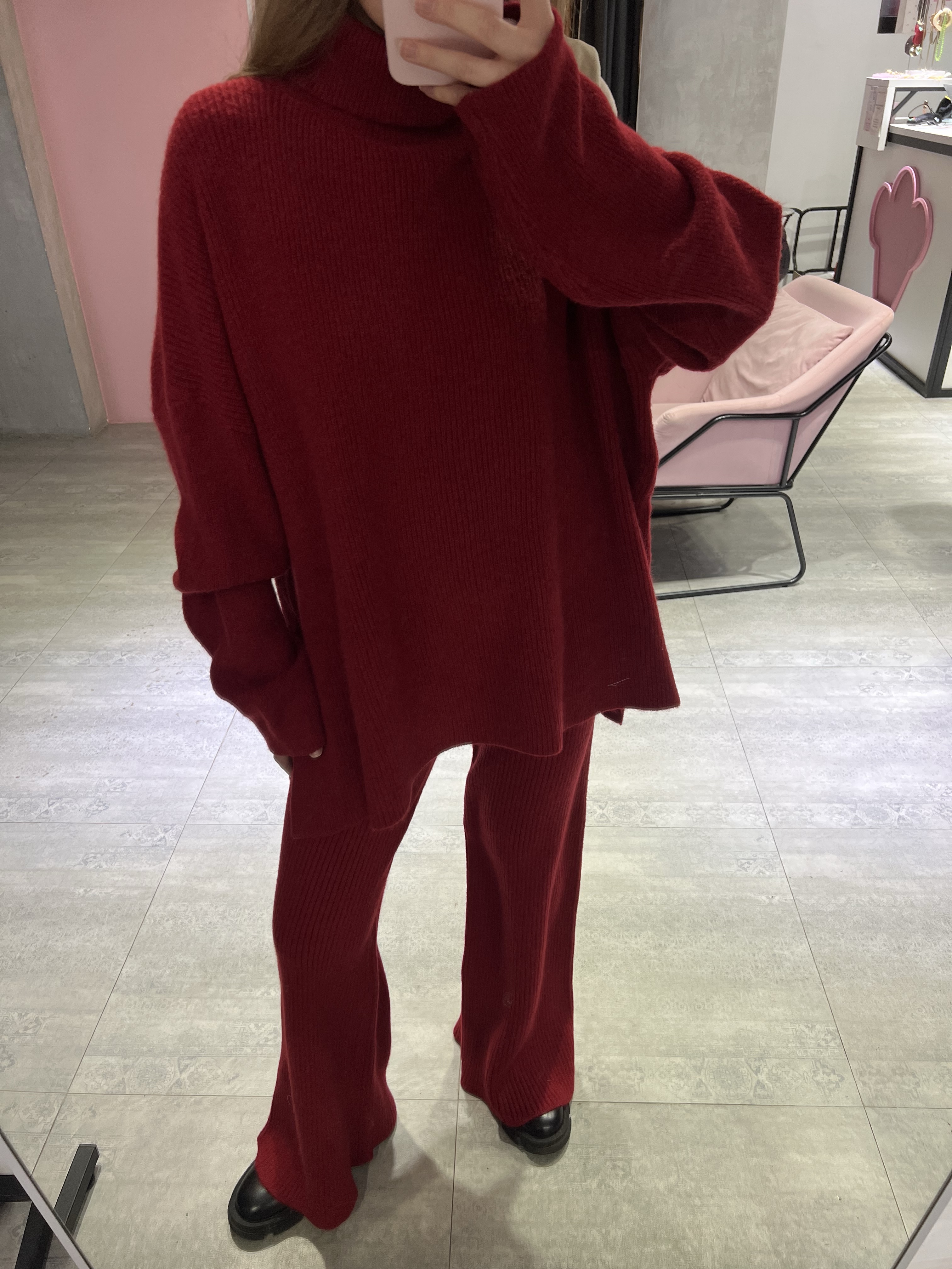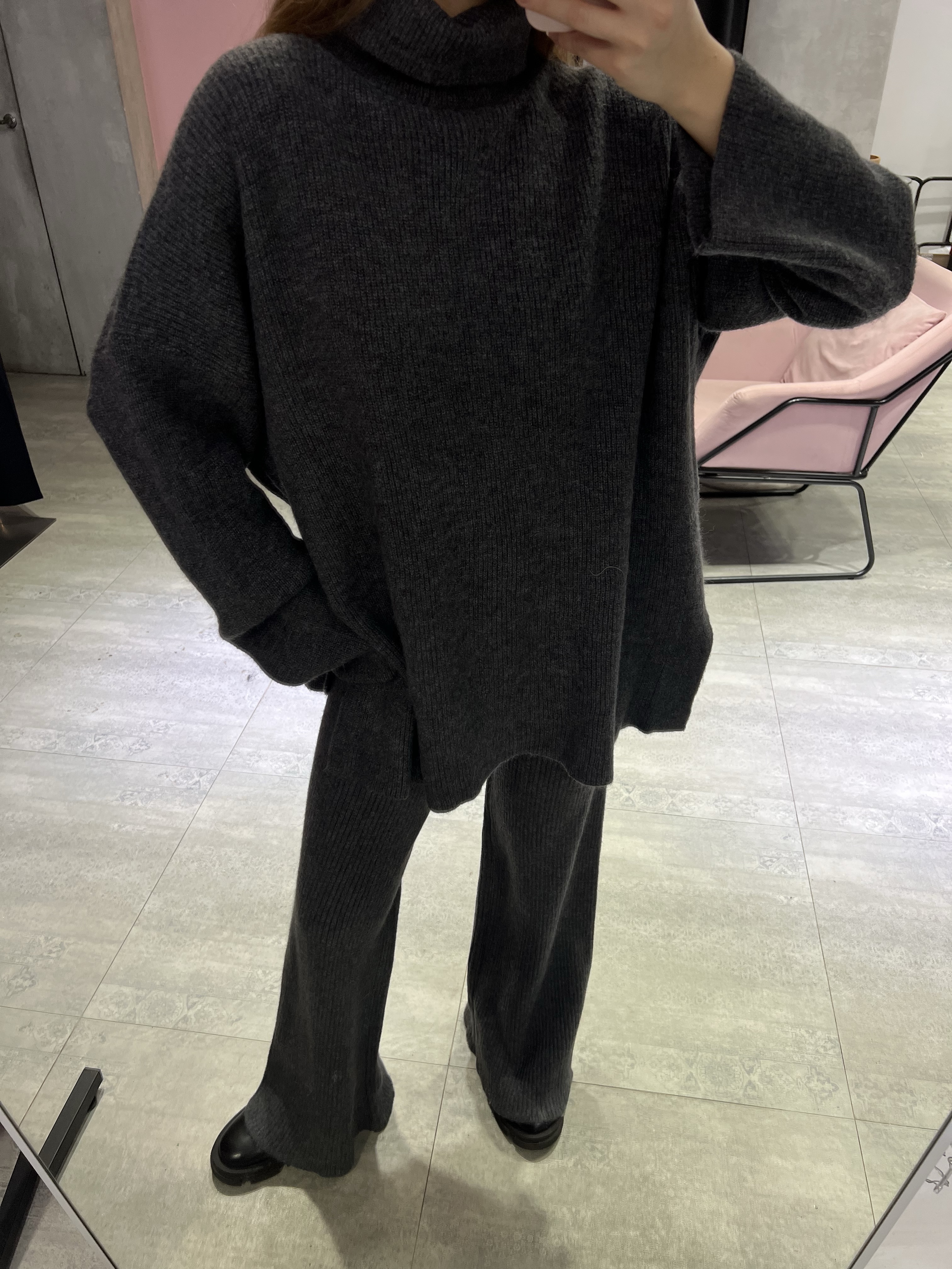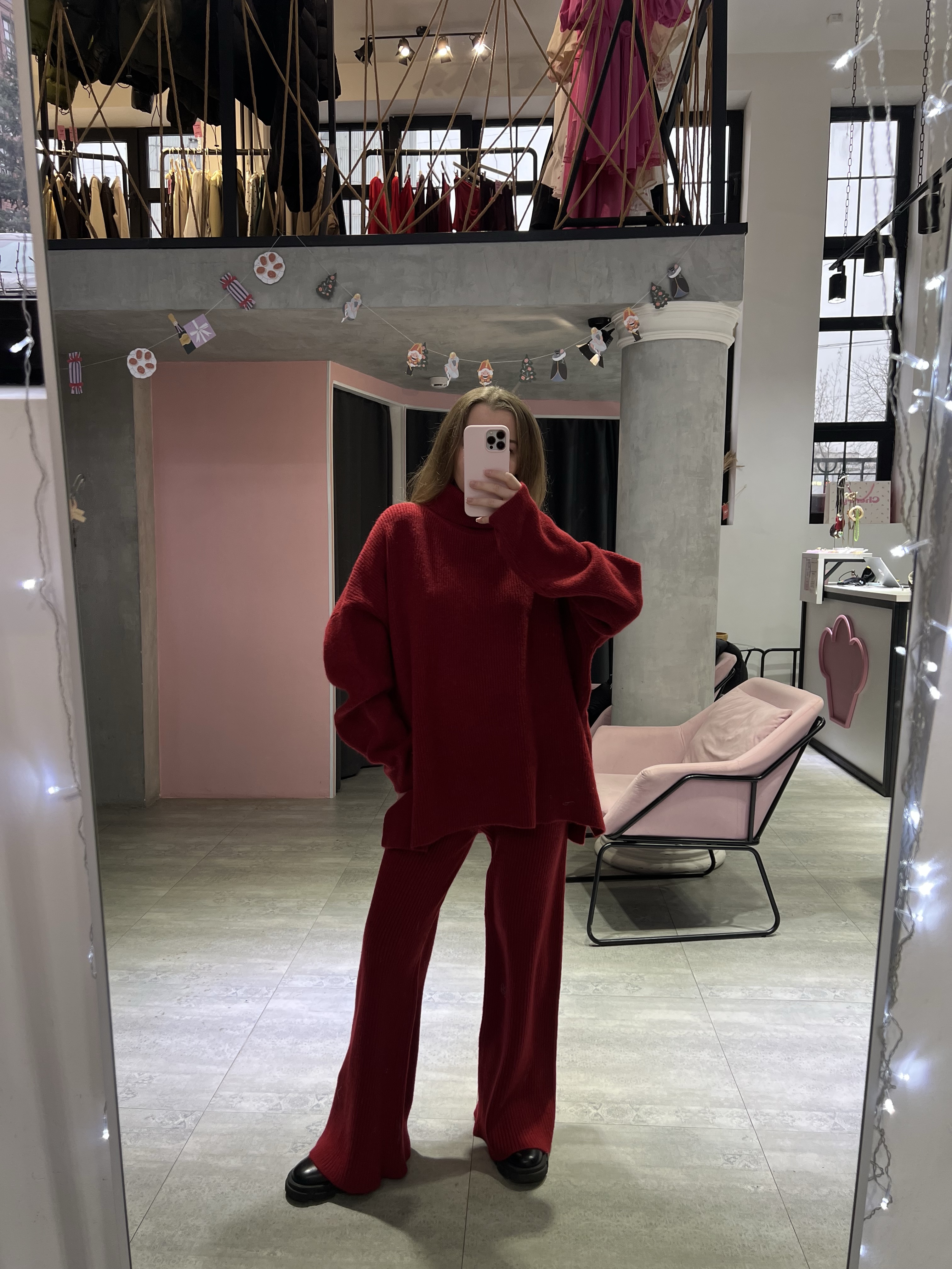 Этот шерстяной костюм — про спокойную уверенность и продуманный комфорт на каждый день. Свитер оверсайз с высоким горлом мягко окутывает и держит тепло, создавая расслабленный, но собранный силуэт. Фактура смотрится благородно и аккуратно, без лишней строгости — тот самый баланс, который легко вписывается в повседневную жизнь.