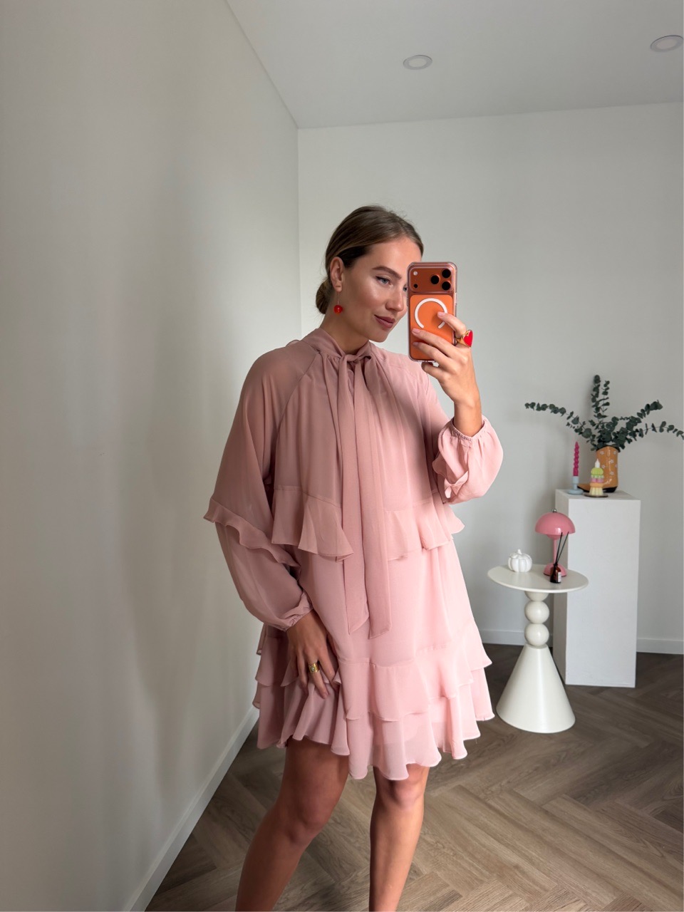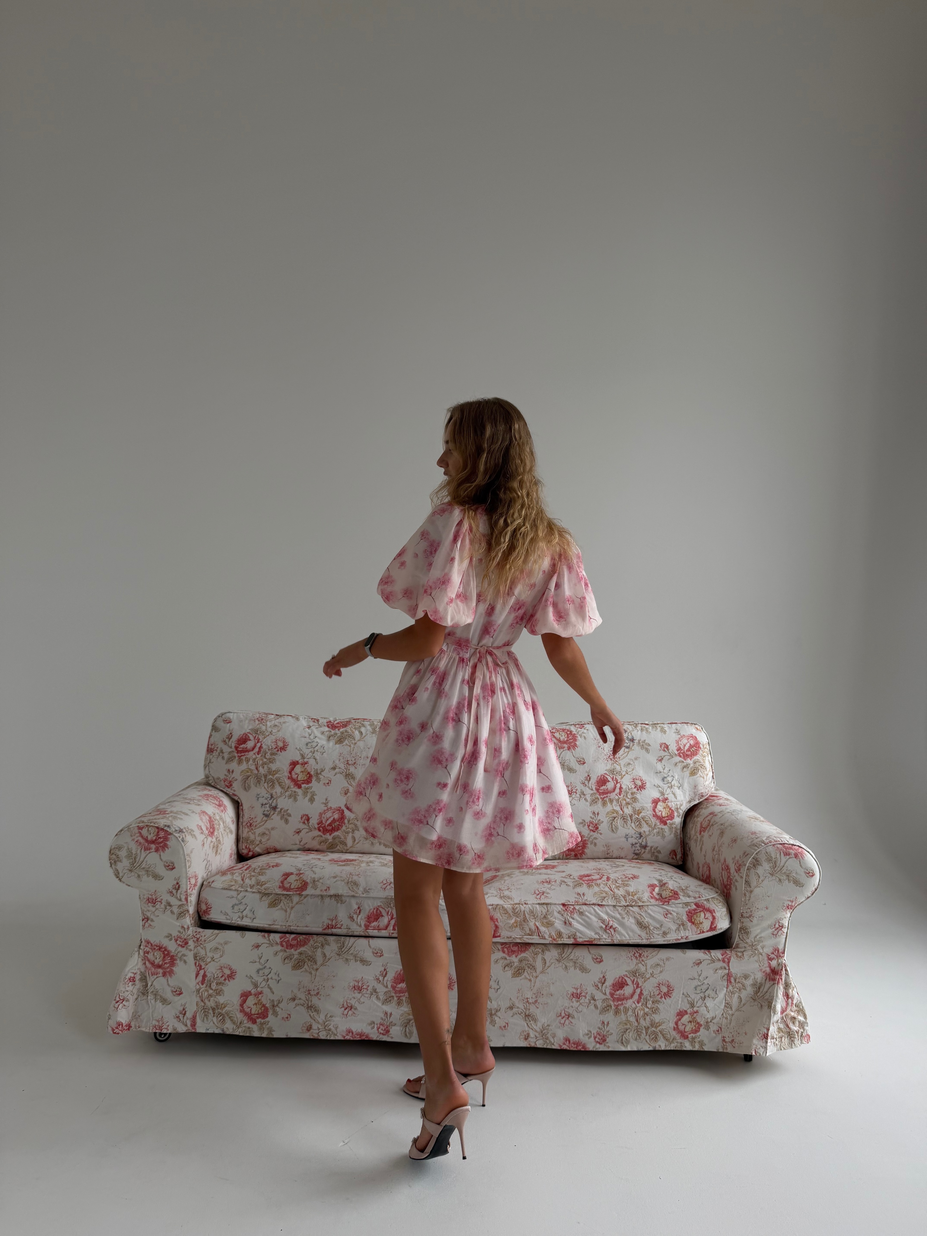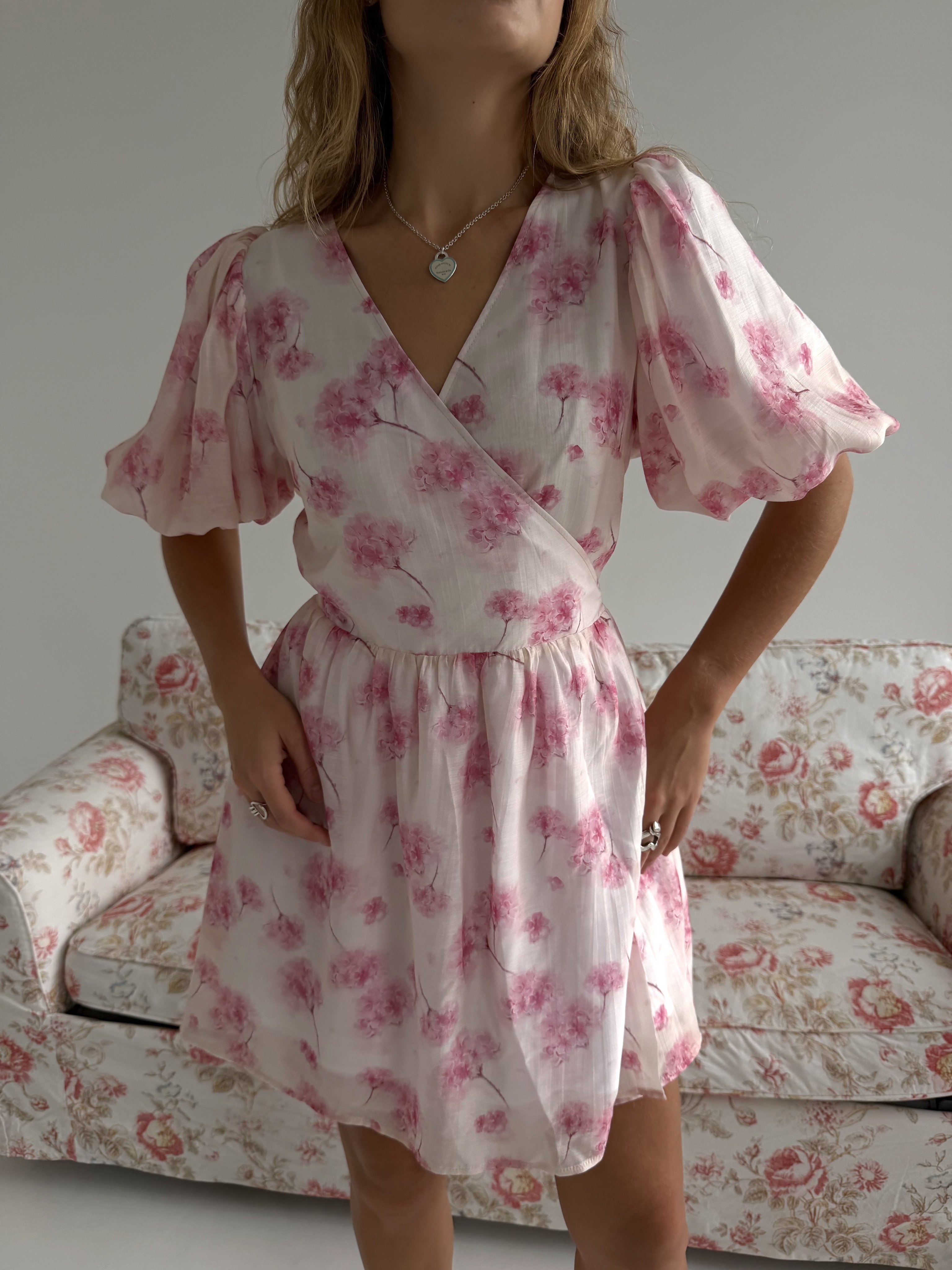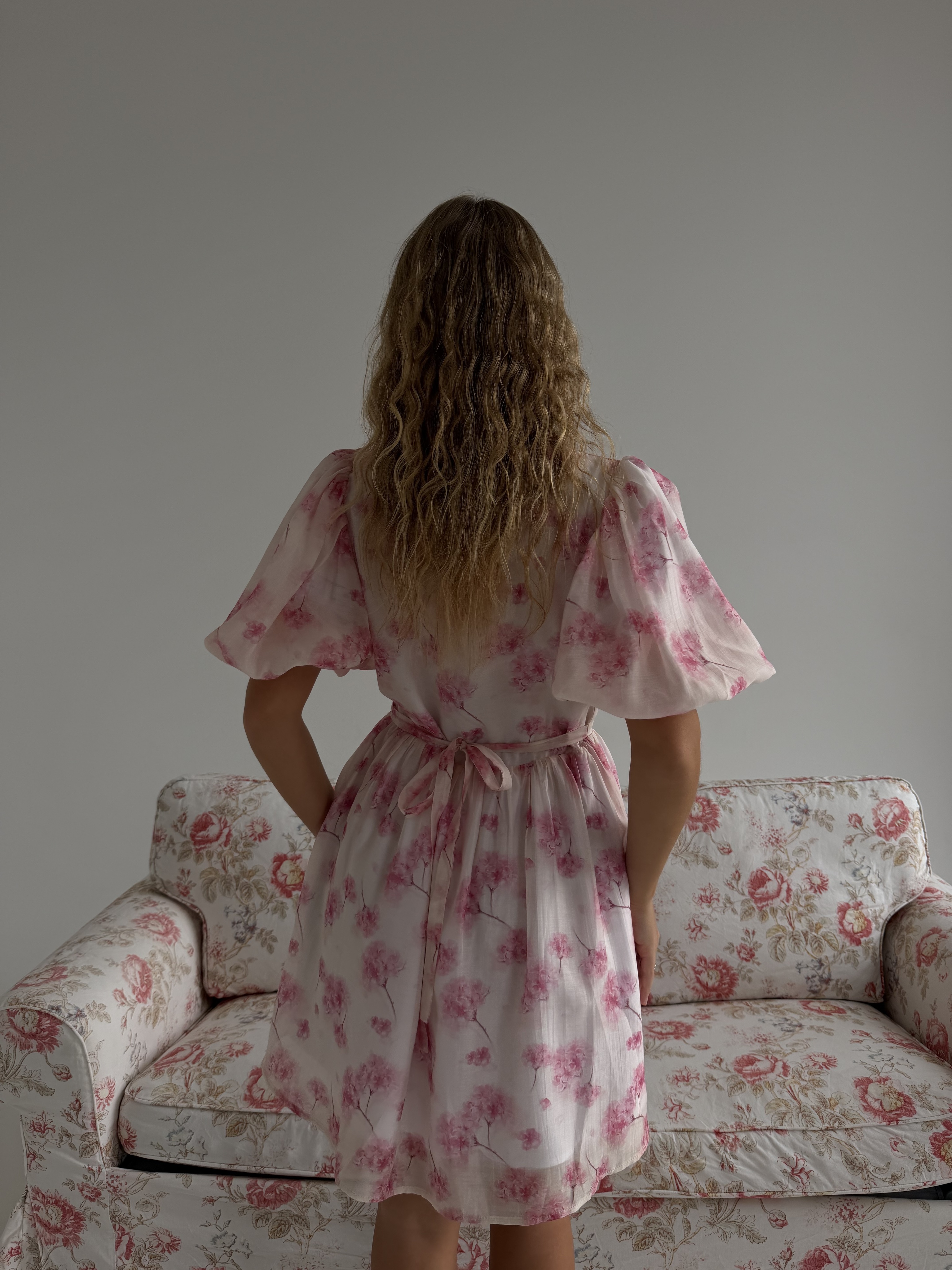 Воздушное платье свободного силуэта с романтичными оборками и объёмными рукавами, собранными на манжеты. Высокая горловина с длинными завязками добавляет образу утончённость и выразительность.