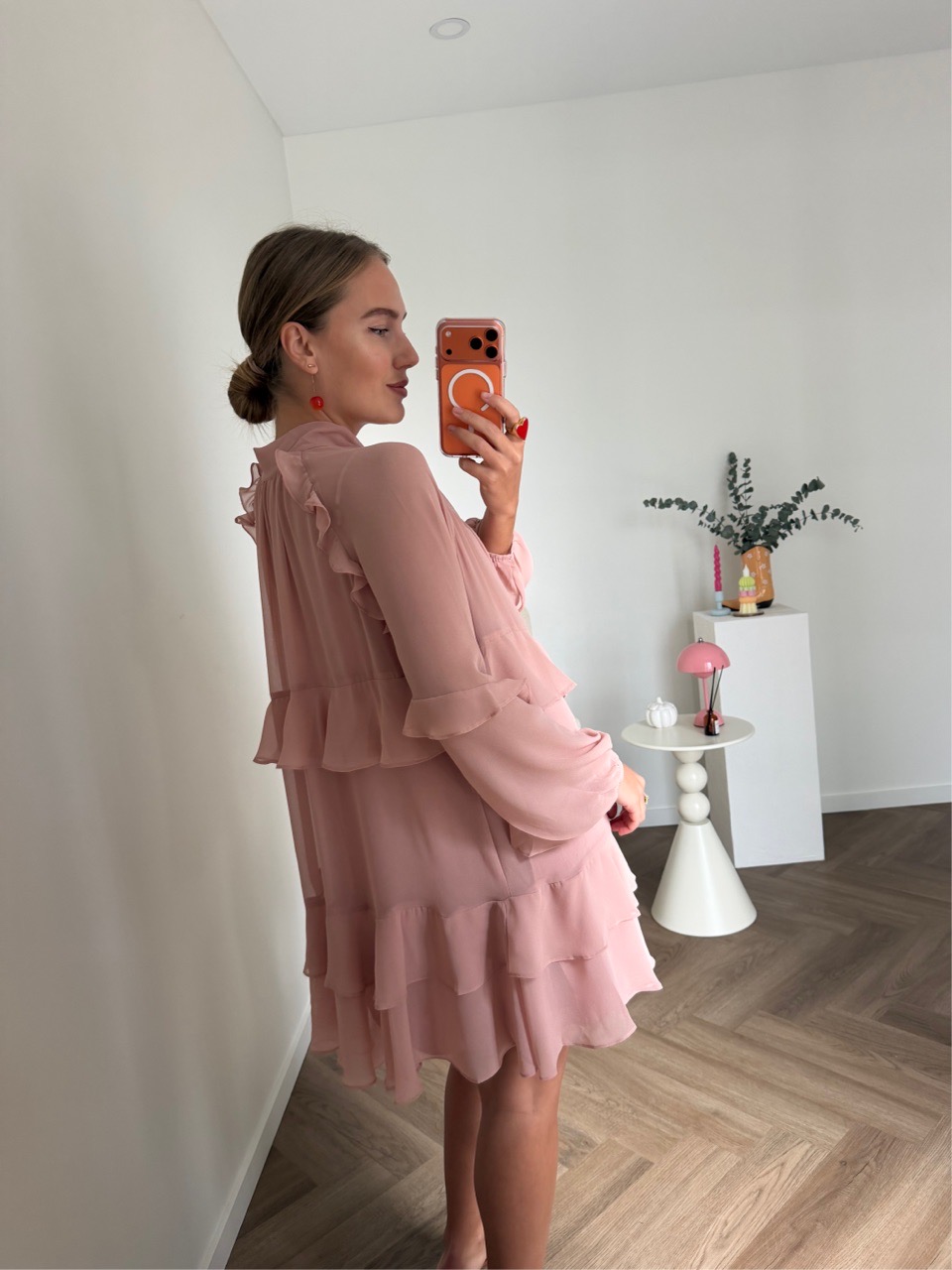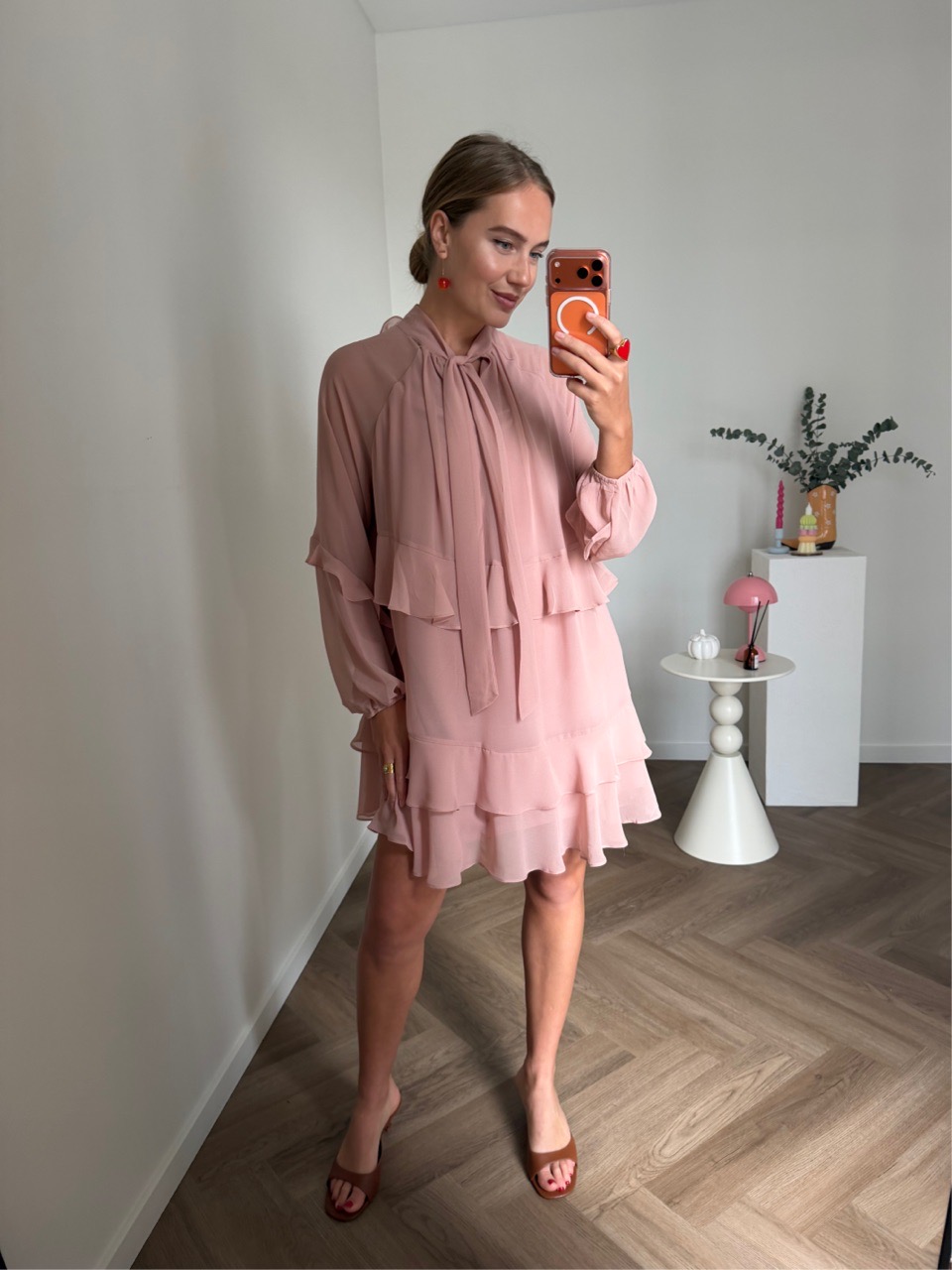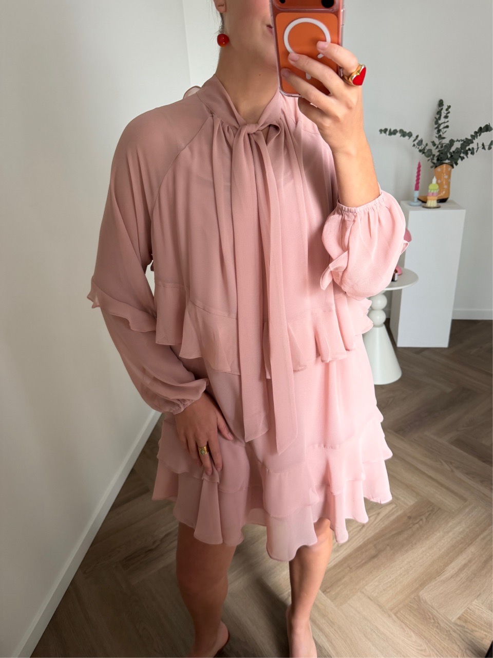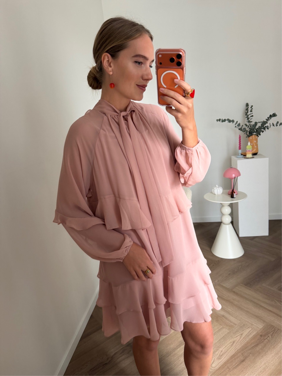 Воздушное платье свободного силуэта с романтичными оборками и объёмными рукавами, собранными на манжеты. Высокая горловина с длинными завязками добавляет образу утончённость и выразительность.