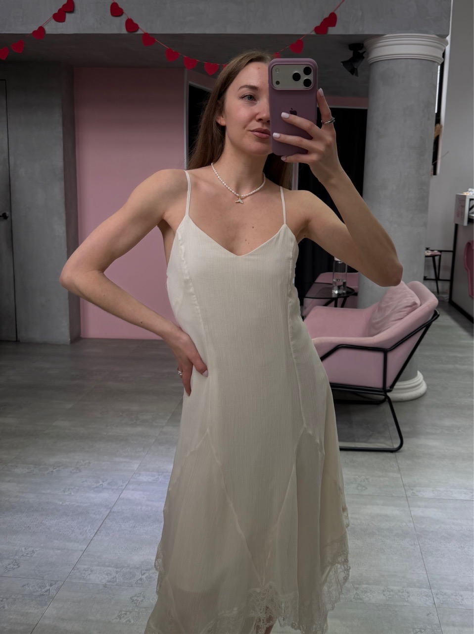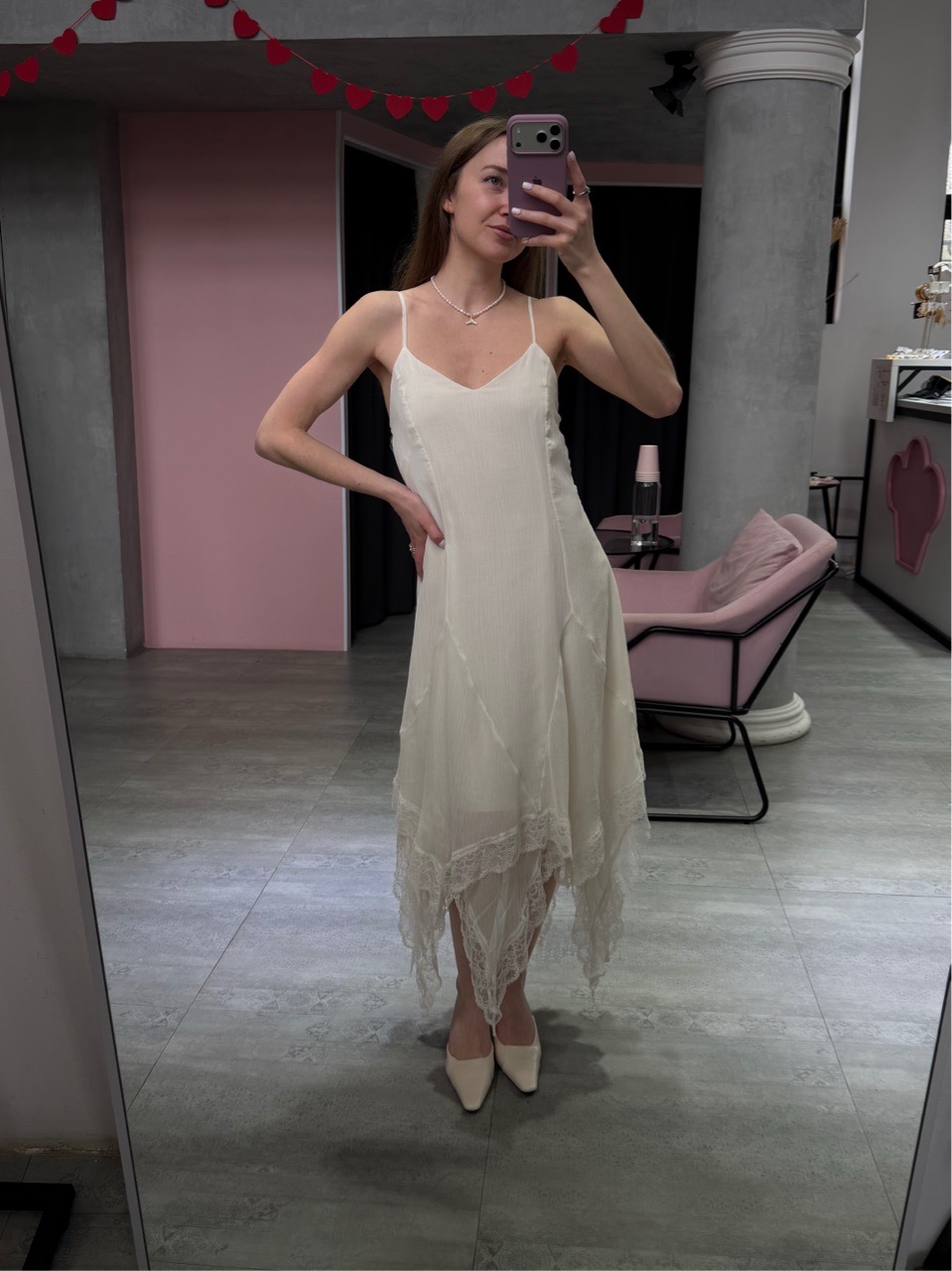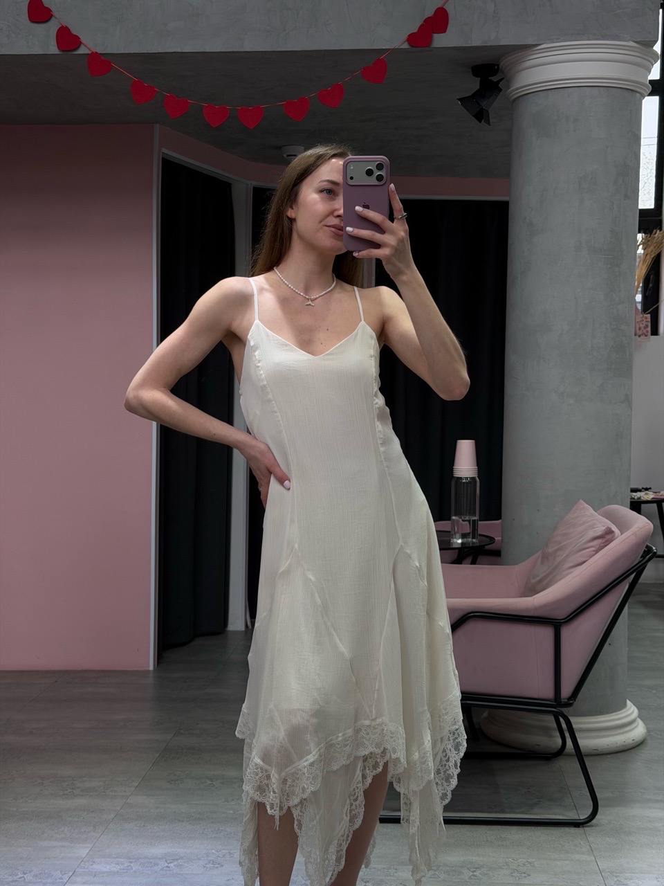 Лёгкая сорочка-комбинация на тонких бретелях с мягким струящимся силуэтом и асимметричной линией низа, дополненной кружевной отделкой. Деликатная ткань красиво движется при ходьбе и создаёт утончённый, женственный образ.