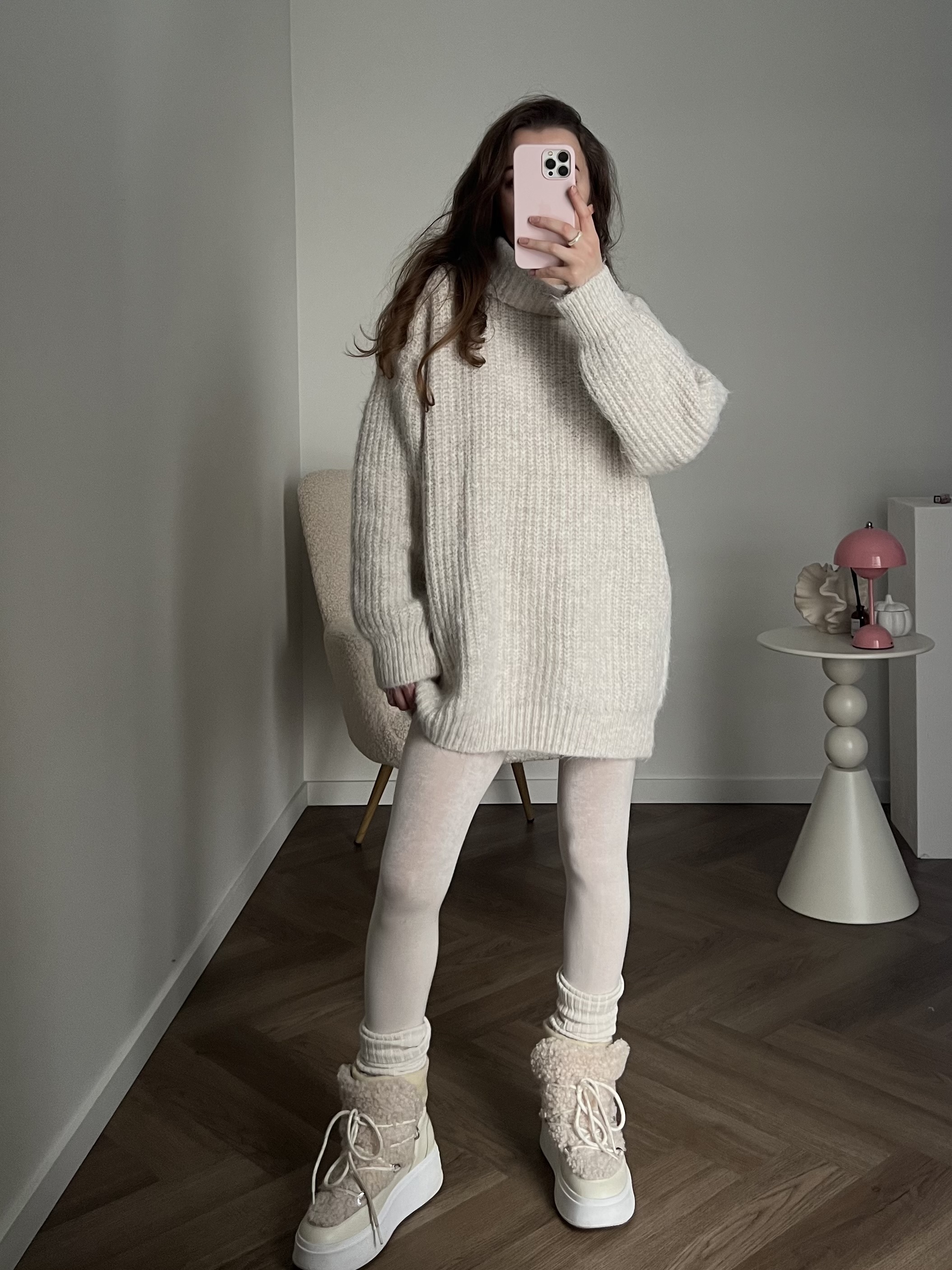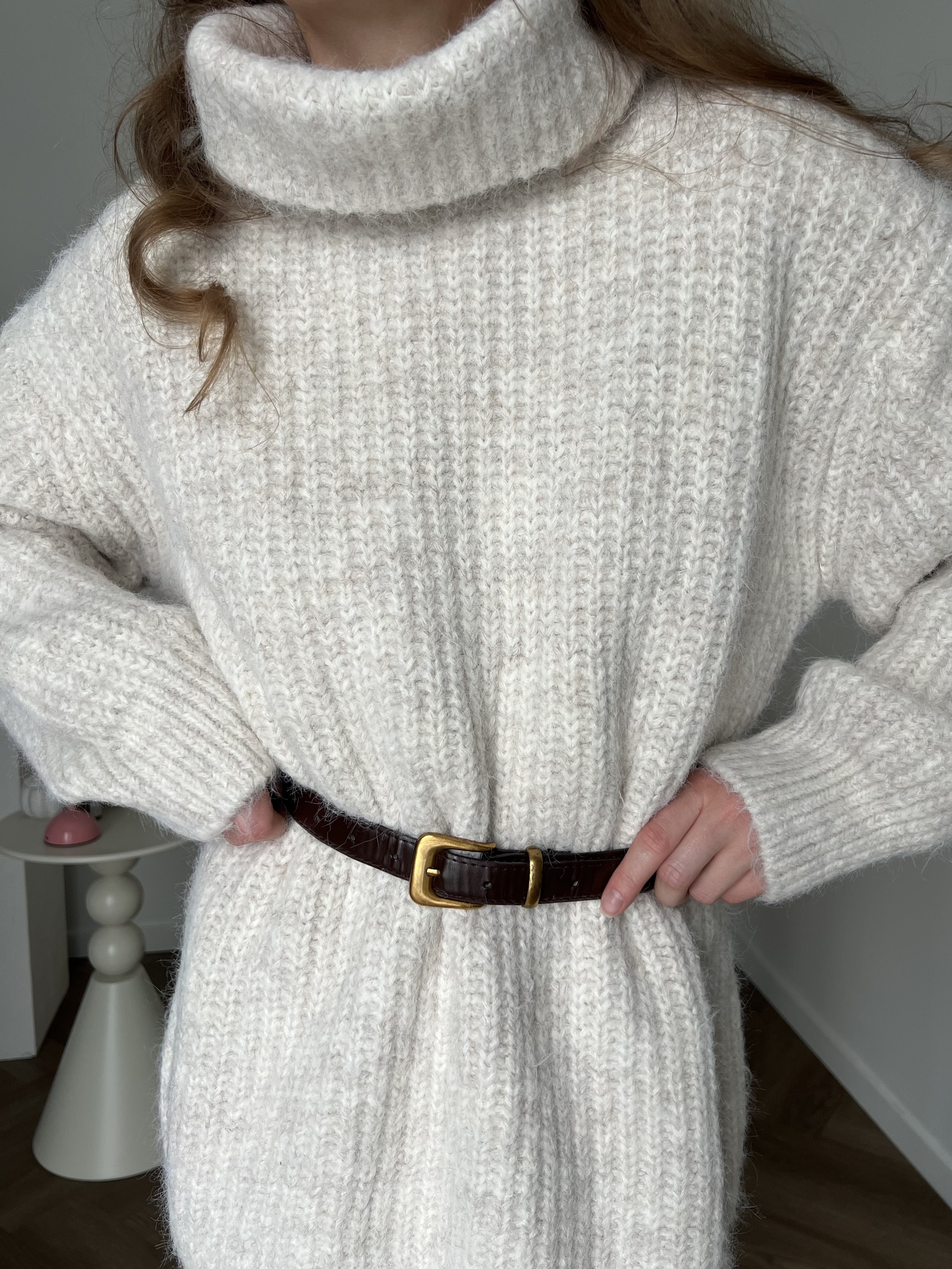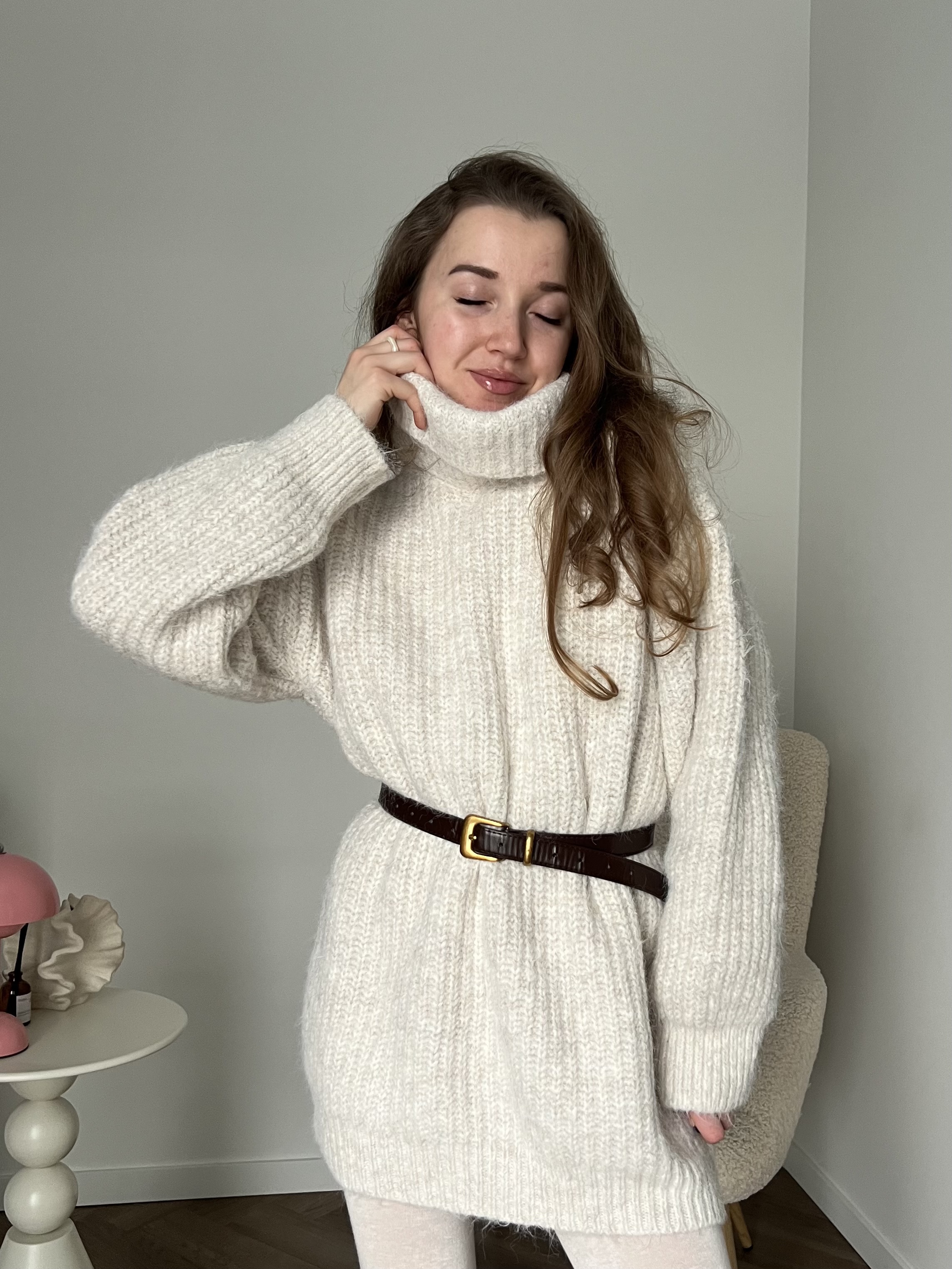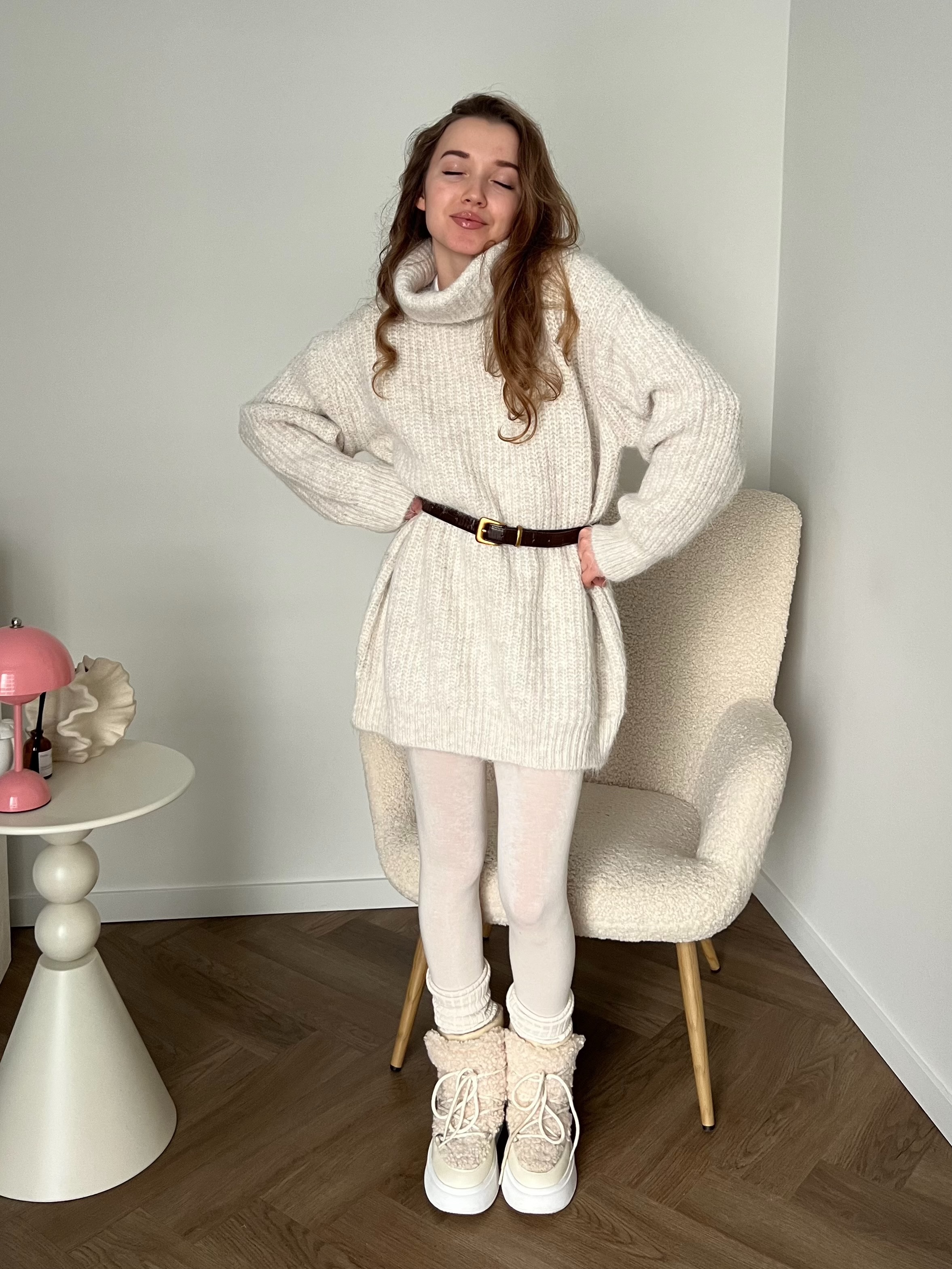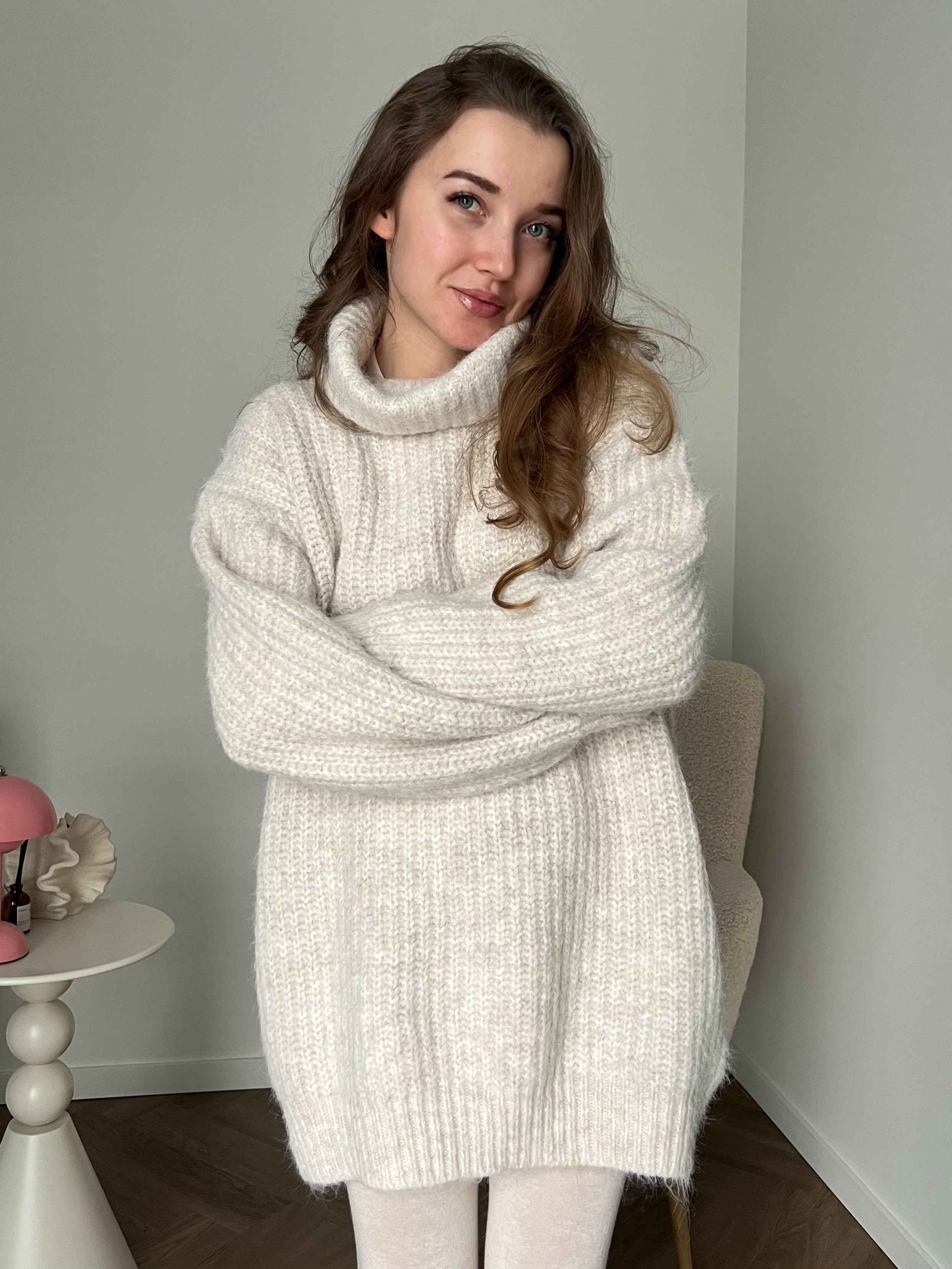 Свободный оверсайз крой, подчёркивающий непринужденность и лёгкость образа. Благодаря удлинённому силуэту свитер можно носить как самостоятельный элемент, сочетая с плотными колготками или леггинсами, либо как верхний слой с брюками или джинсами.