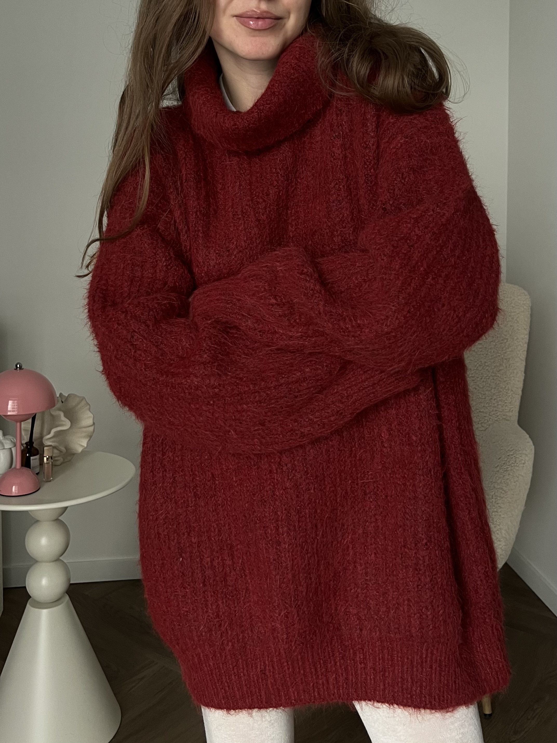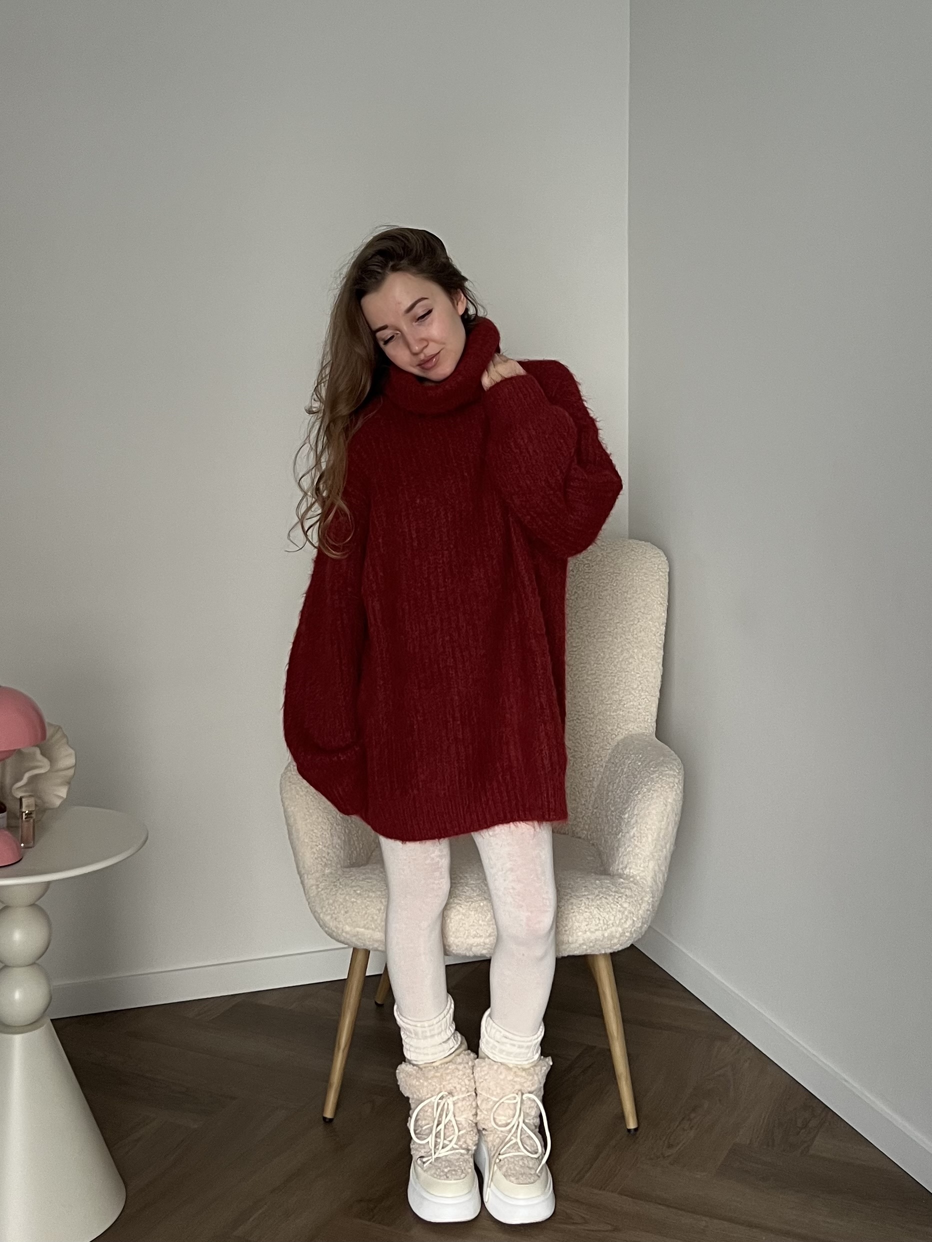 Свободный оверсайз крой, подчёркивающий непринужденность и лёгкость образа. Благодаря удлинённому силуэту свитер можно носить как самостоятельный элемент, сочетая с плотными колготками или леггинсами, либо как верхний слой с брюками или джинсами.