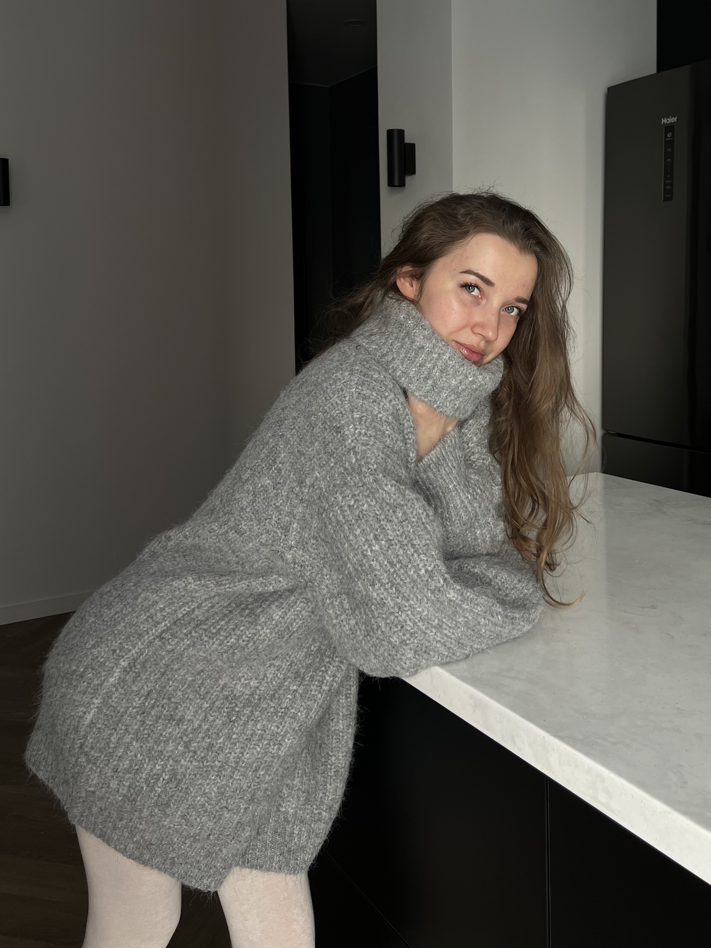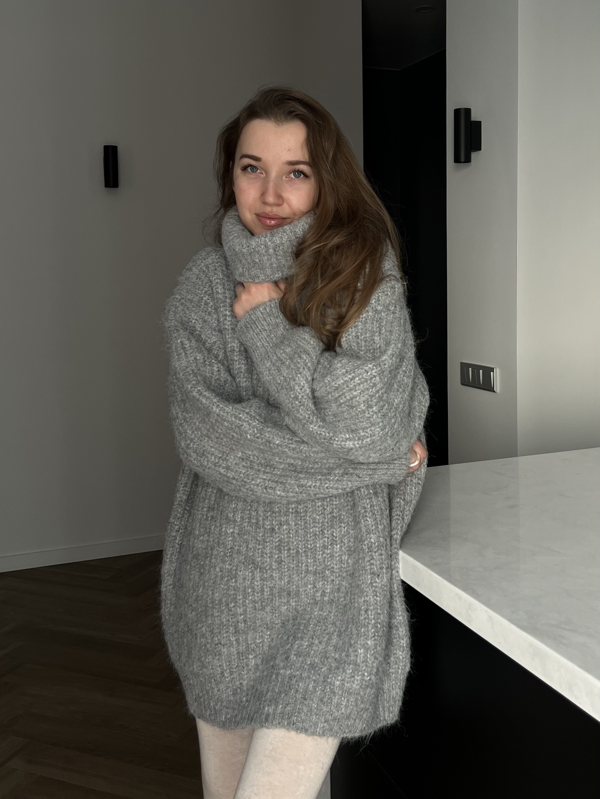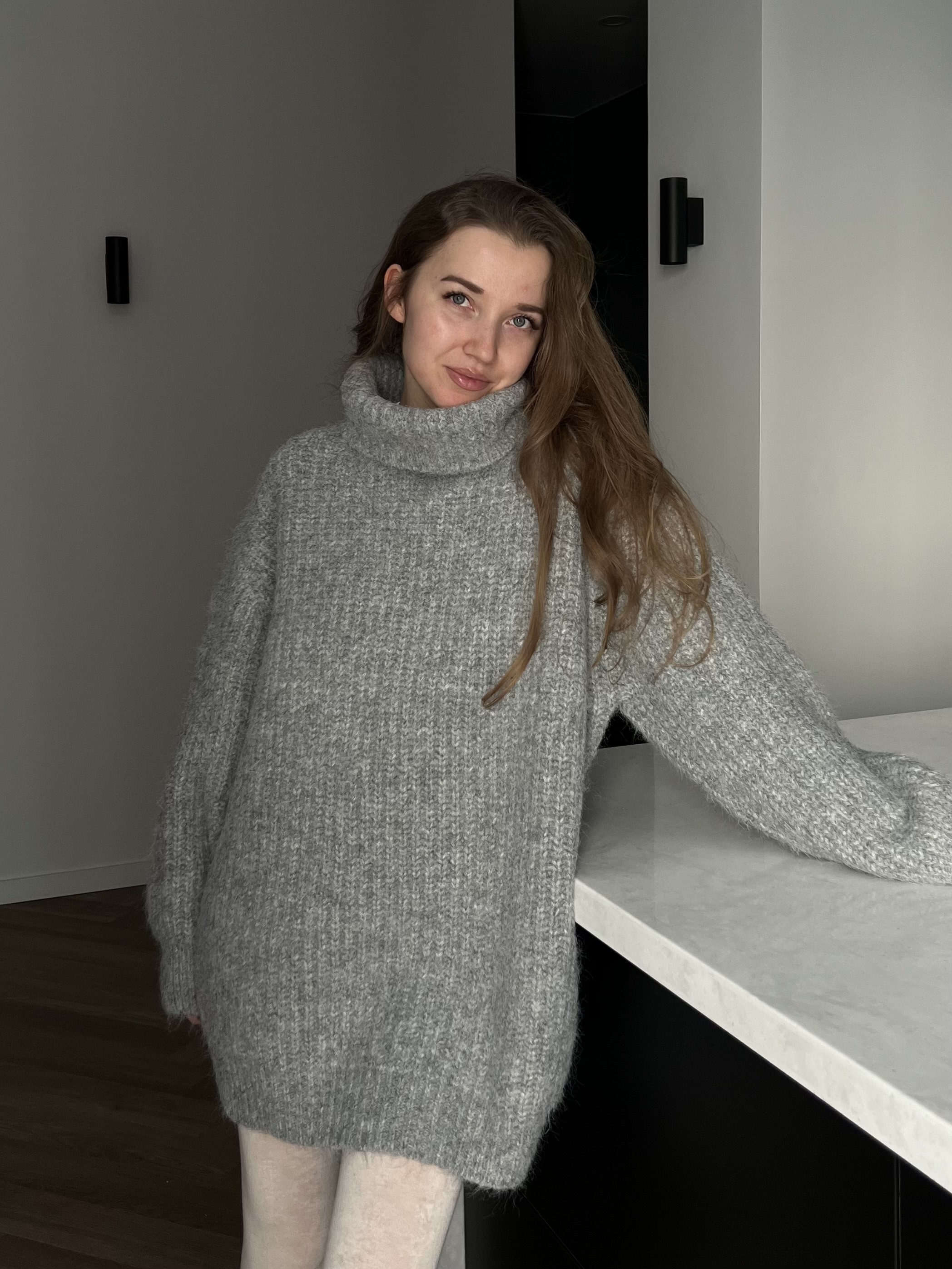 Свободный оверсайз крой, подчёркивающий непринужденность и лёгкость образа. Благодаря удлинённому силуэту свитер можно носить как самостоятельный элемент, сочетая с плотными колготками или леггинсами, либо как верхний слой с брюками или джинсами.