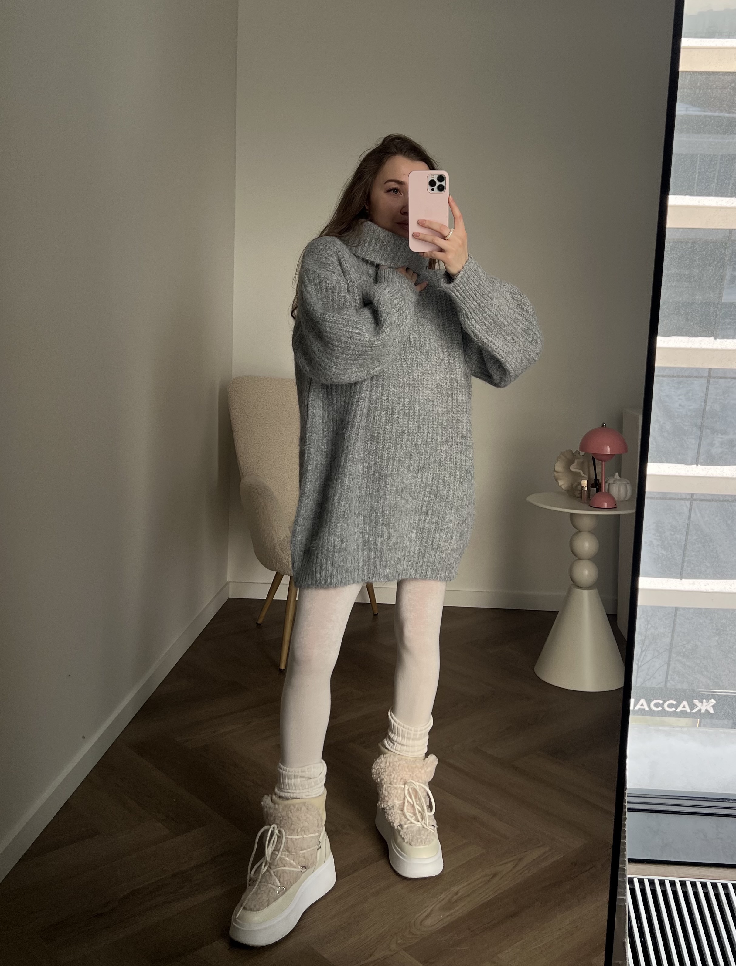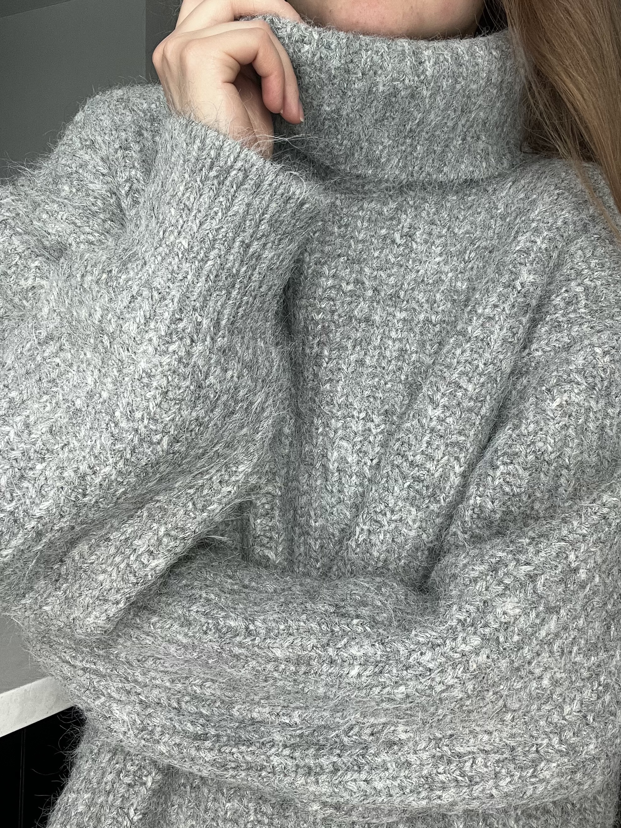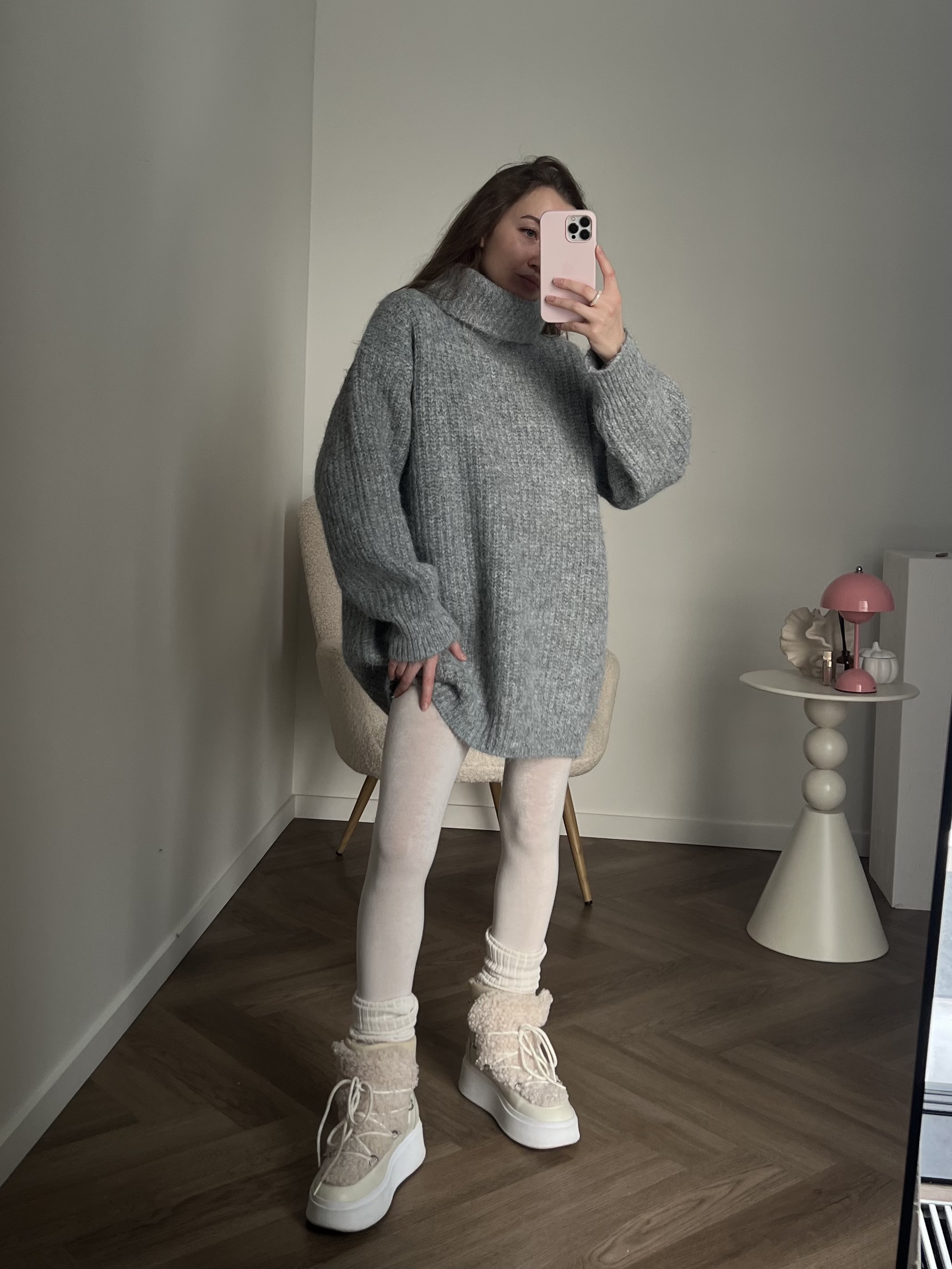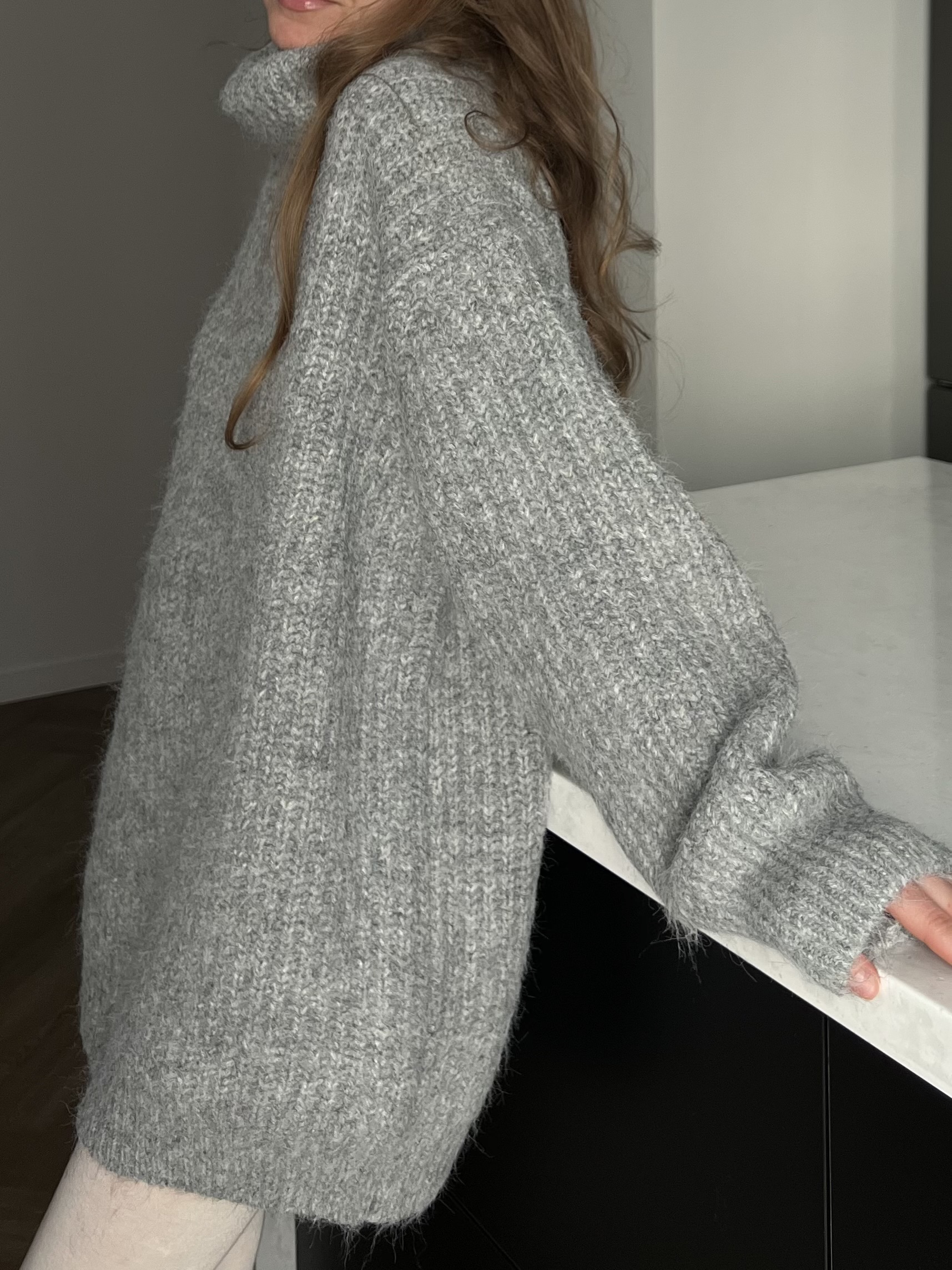 Свободный оверсайз крой, подчёркивающий непринужденность и лёгкость образа. Благодаря удлинённому силуэту свитер можно носить как самостоятельный элемент, сочетая с плотными колготками или леггинсами, либо как верхний слой с брюками или джинсами.