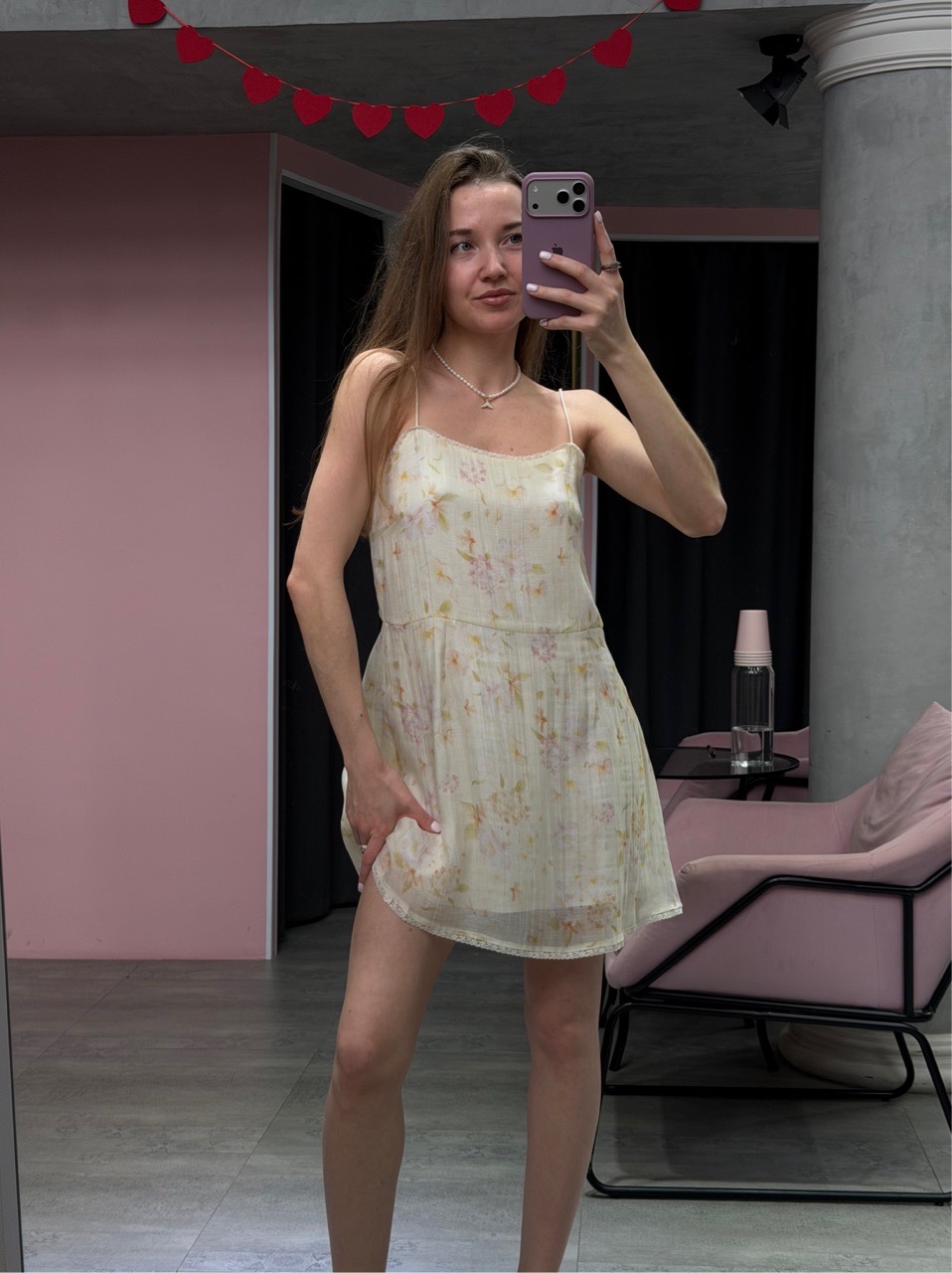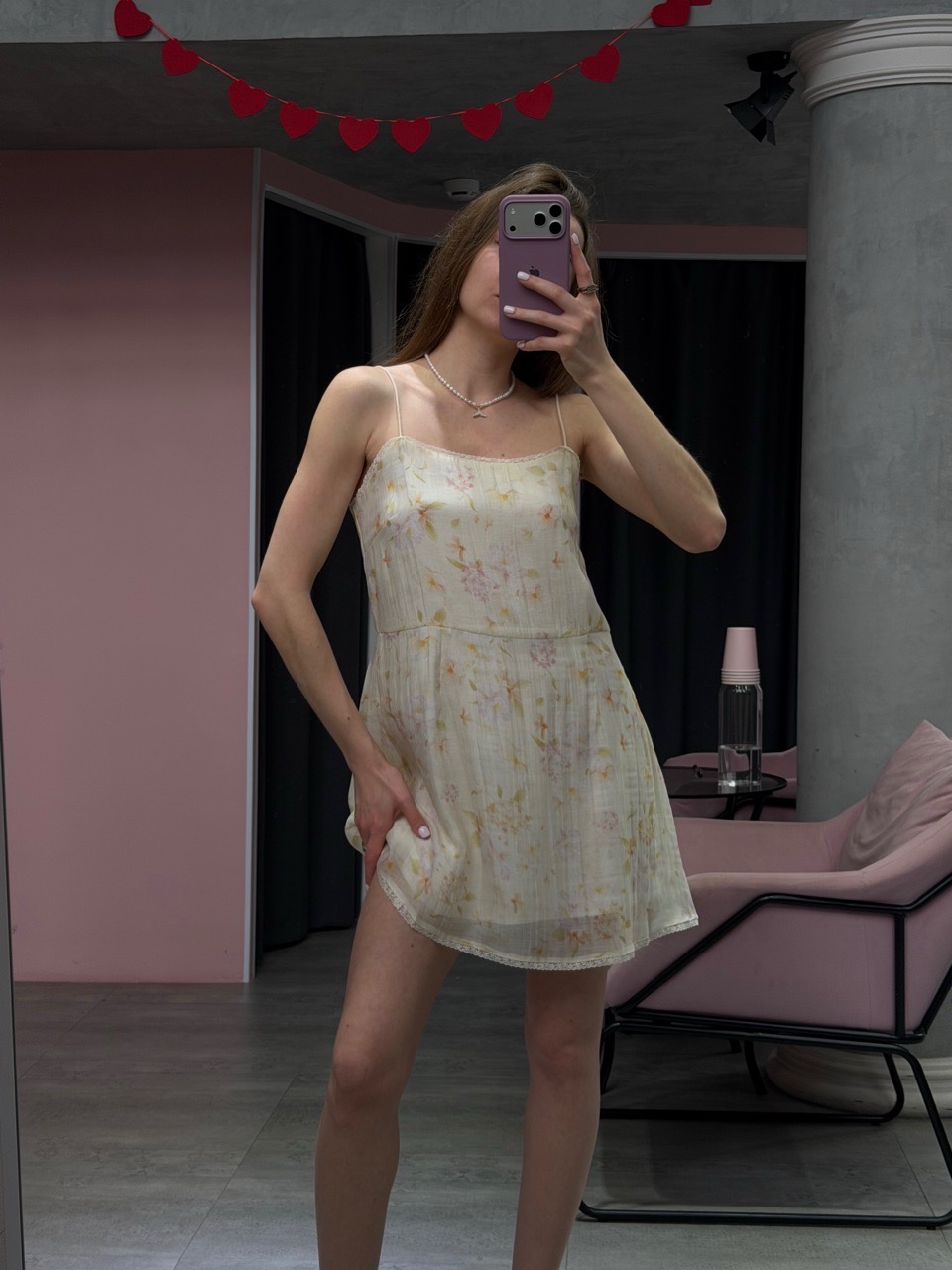 Лёгкое платье мини на тонких бретелях с деликатным цветочным принтом и свободным силуэтом — идеальный вариант для тёплых дней. Воздушная ткань и нежный дизайн создают расслабленное летнее настроение.
