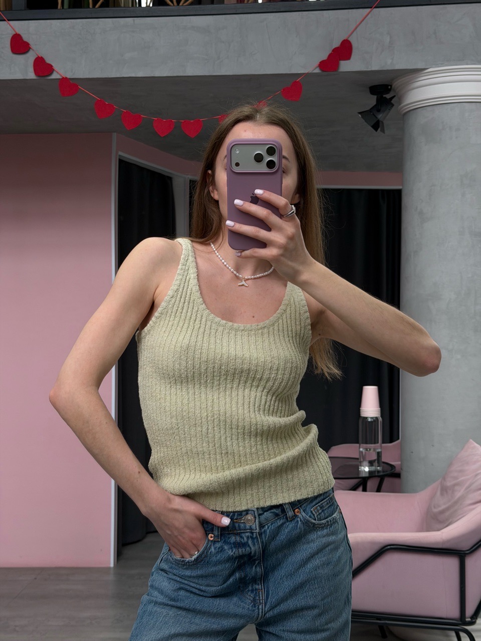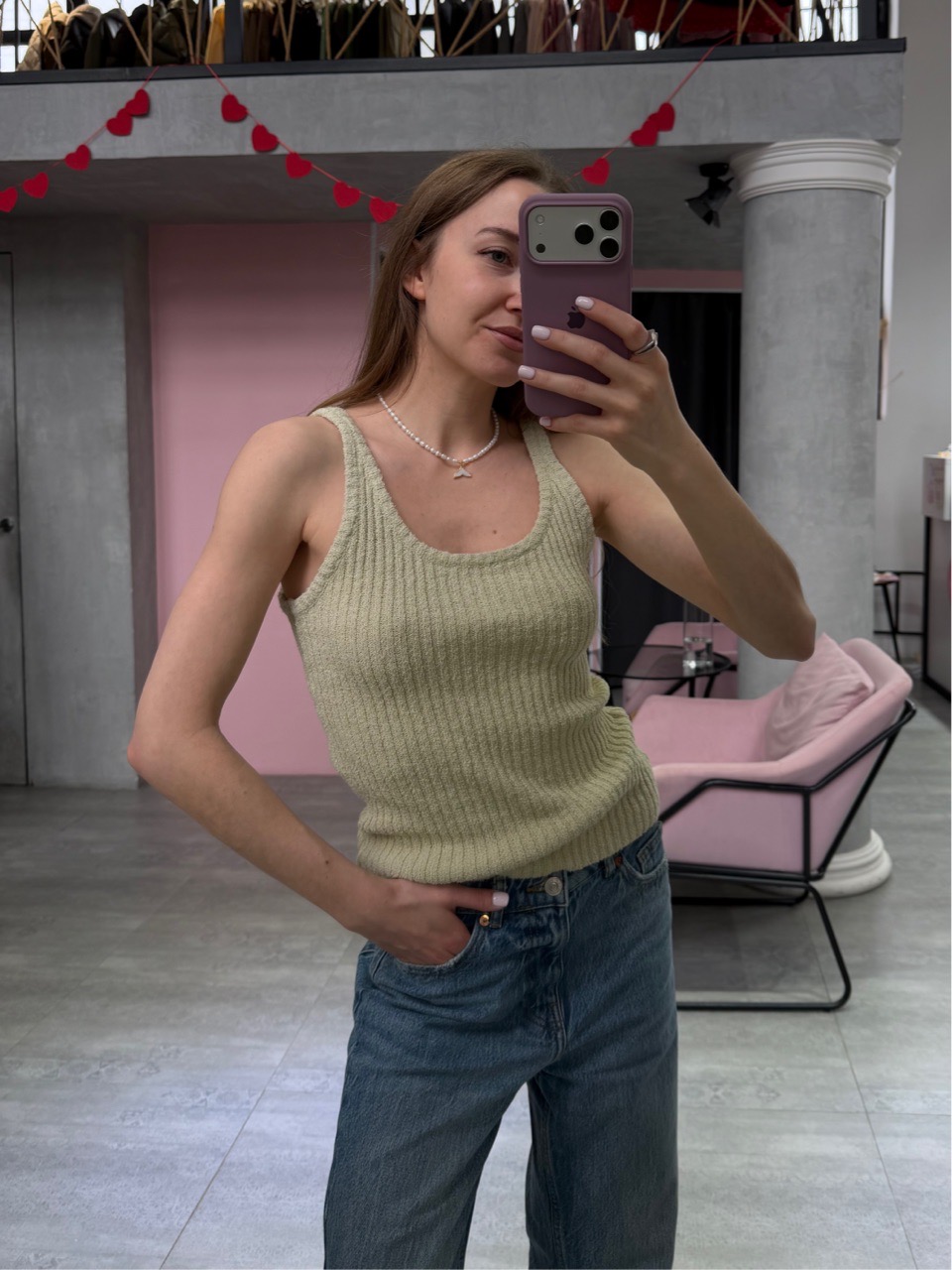 Вязаный топ в рубчик с широкими бретелями и мягким прилегающим силуэтом — универсальная база на тёплый сезон. Эластичная фактура комфортно садится по фигуре и подчёркивает линию плеч.