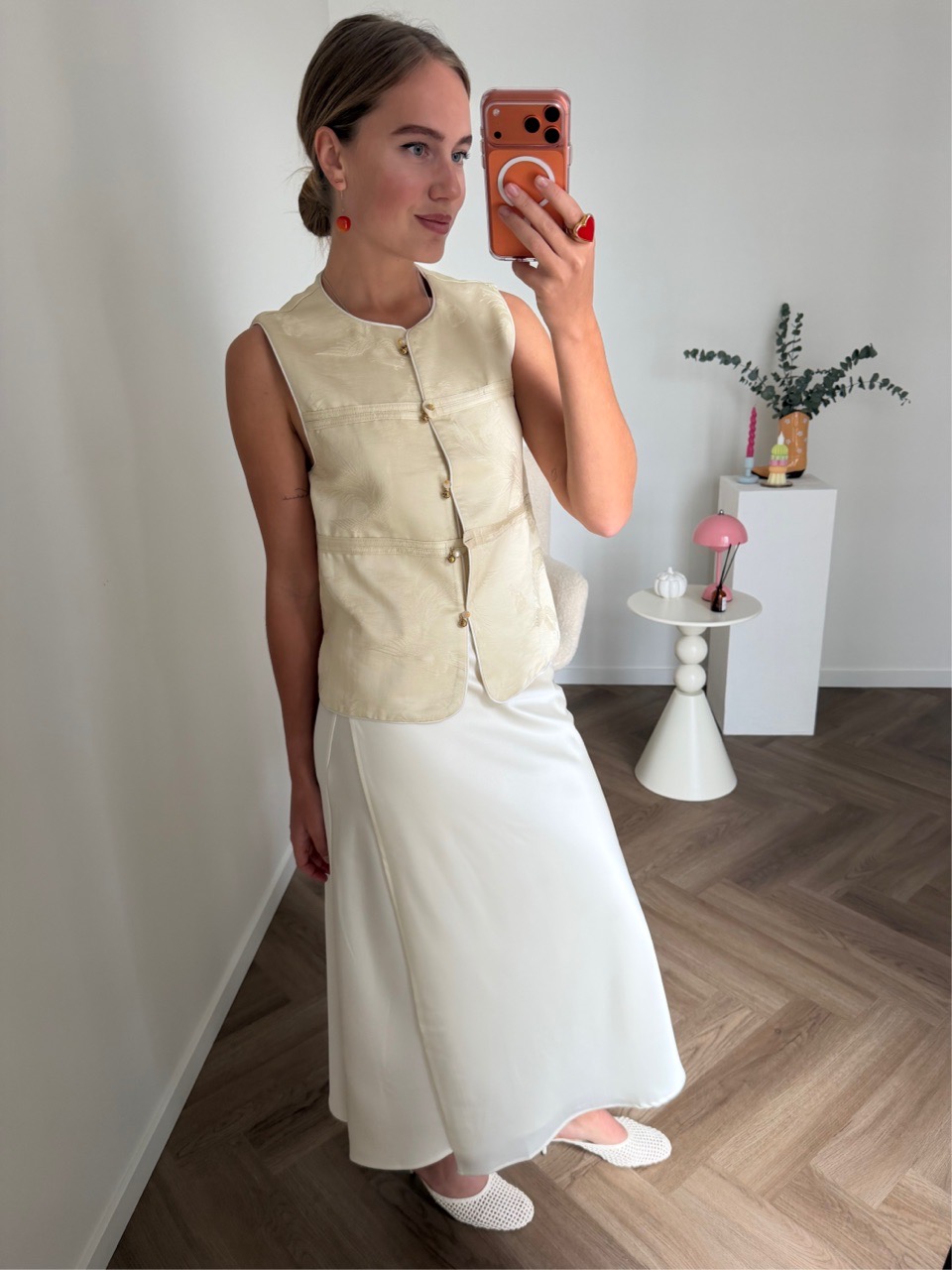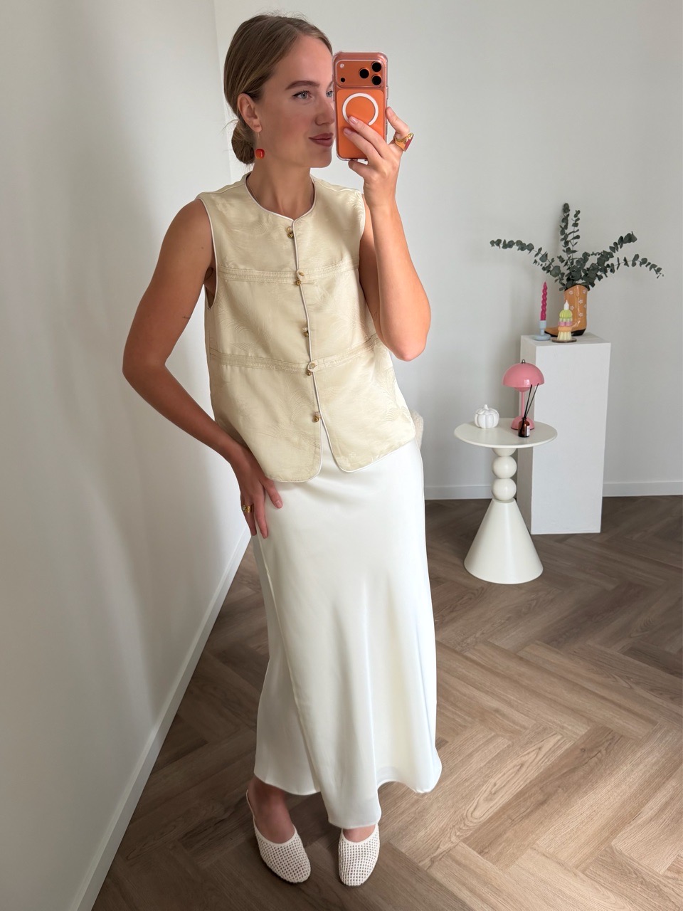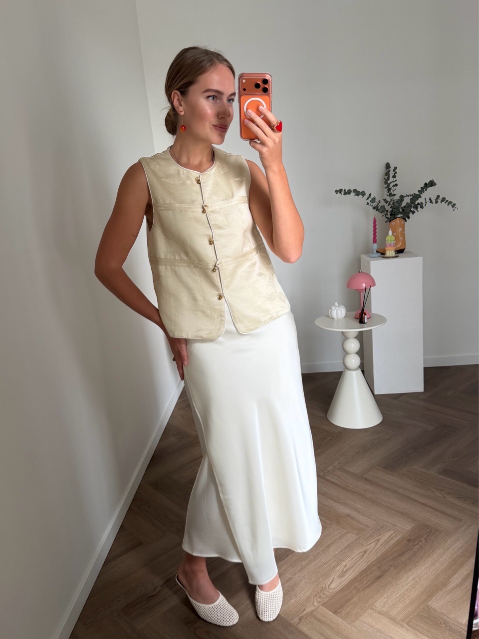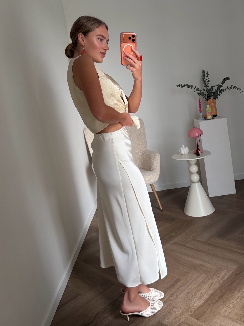 Подойдёт для городских образов, свиданий, отпусков и более собранных выходов. Сочетайте с жилетами, рубашками, свитерами-паутинками, базовыми топами и жакетами, дополняя мюлями, балетками или каблуком.