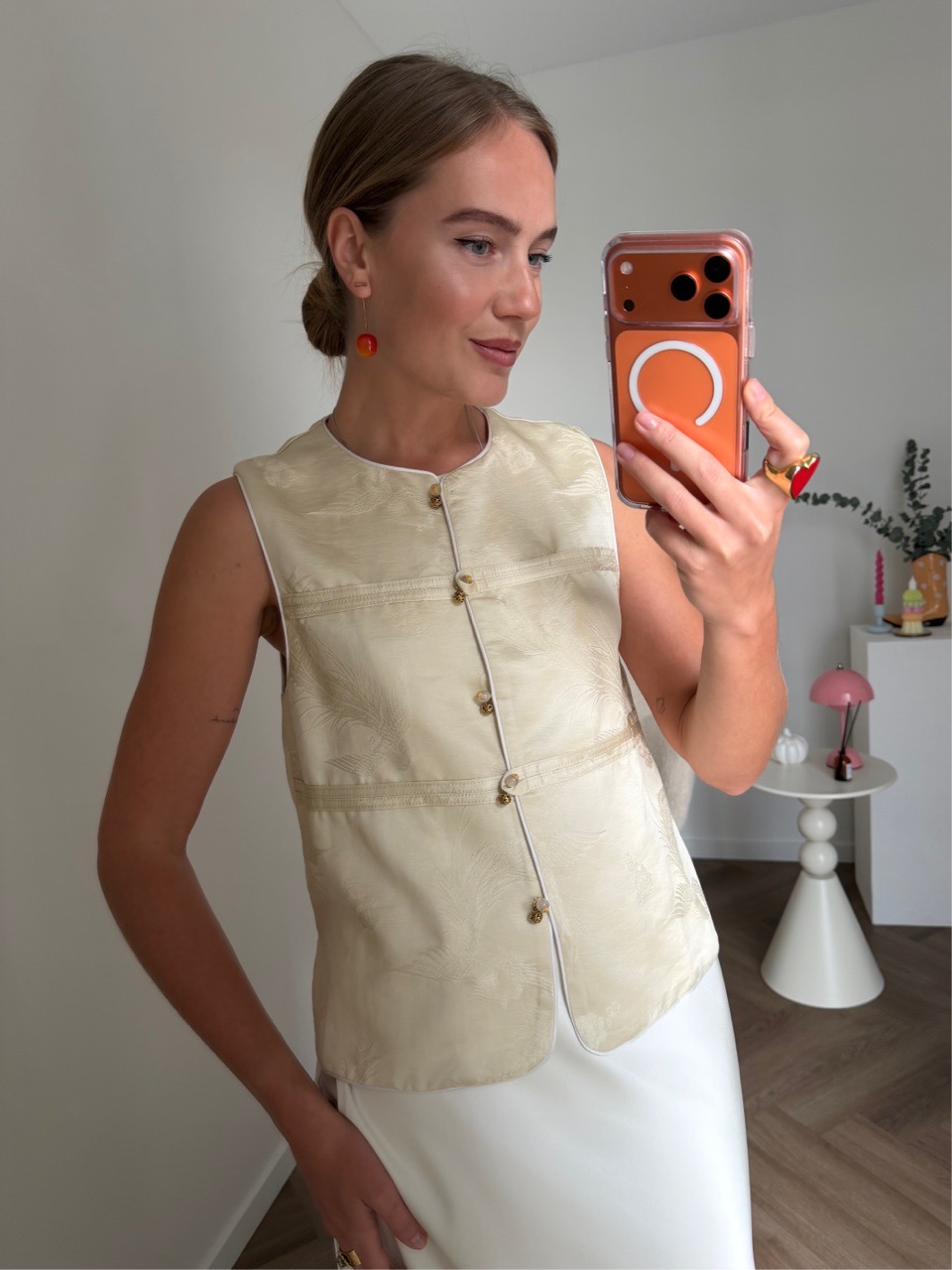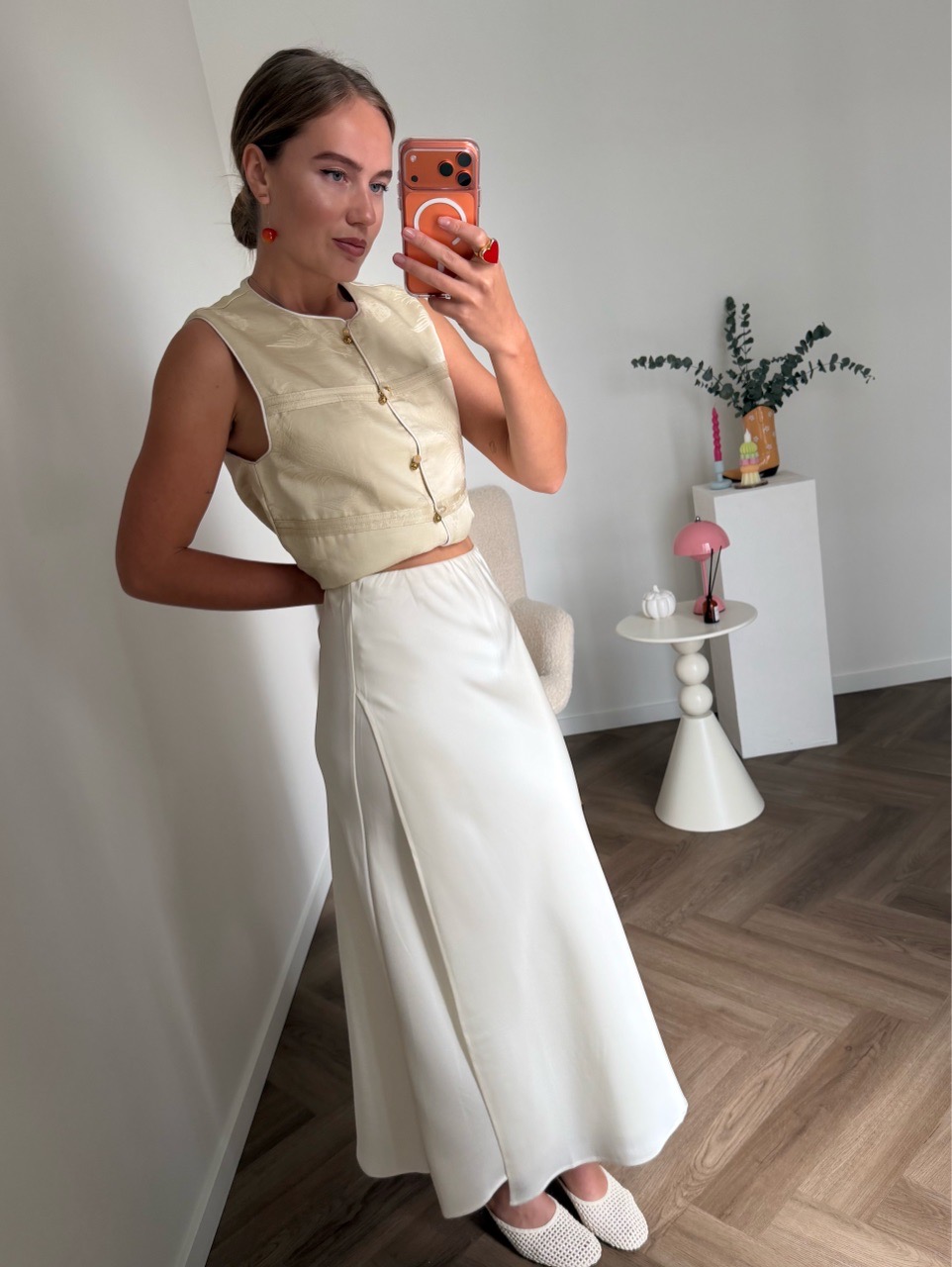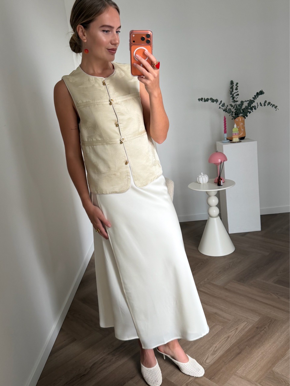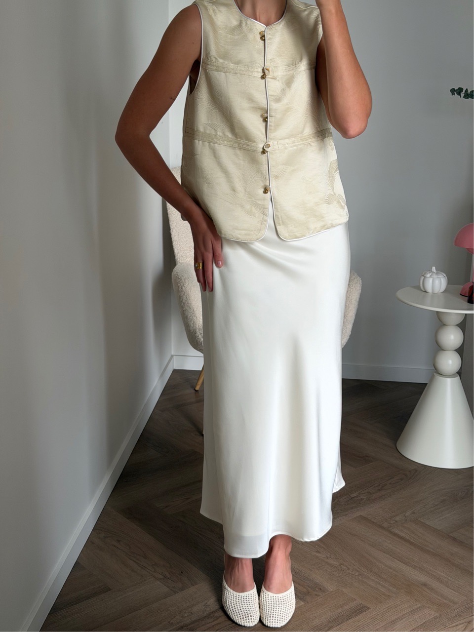 Подойдёт для городских образов, свиданий, отпусков и более собранных выходов. Сочетайте с жилетами, рубашками, свитерами-паутинками, базовыми топами и жакетами, дополняя мюлями, балетками или каблуком.