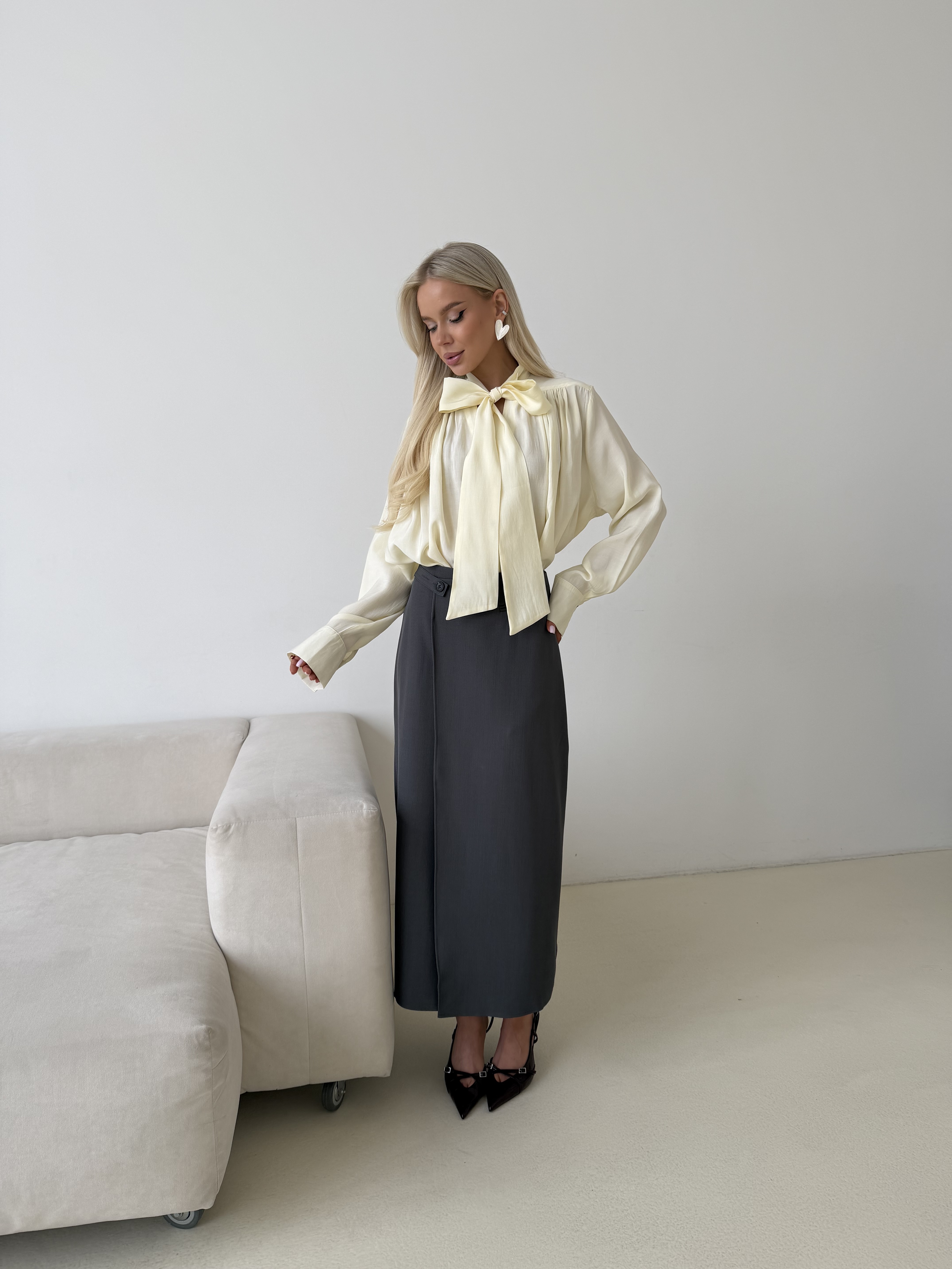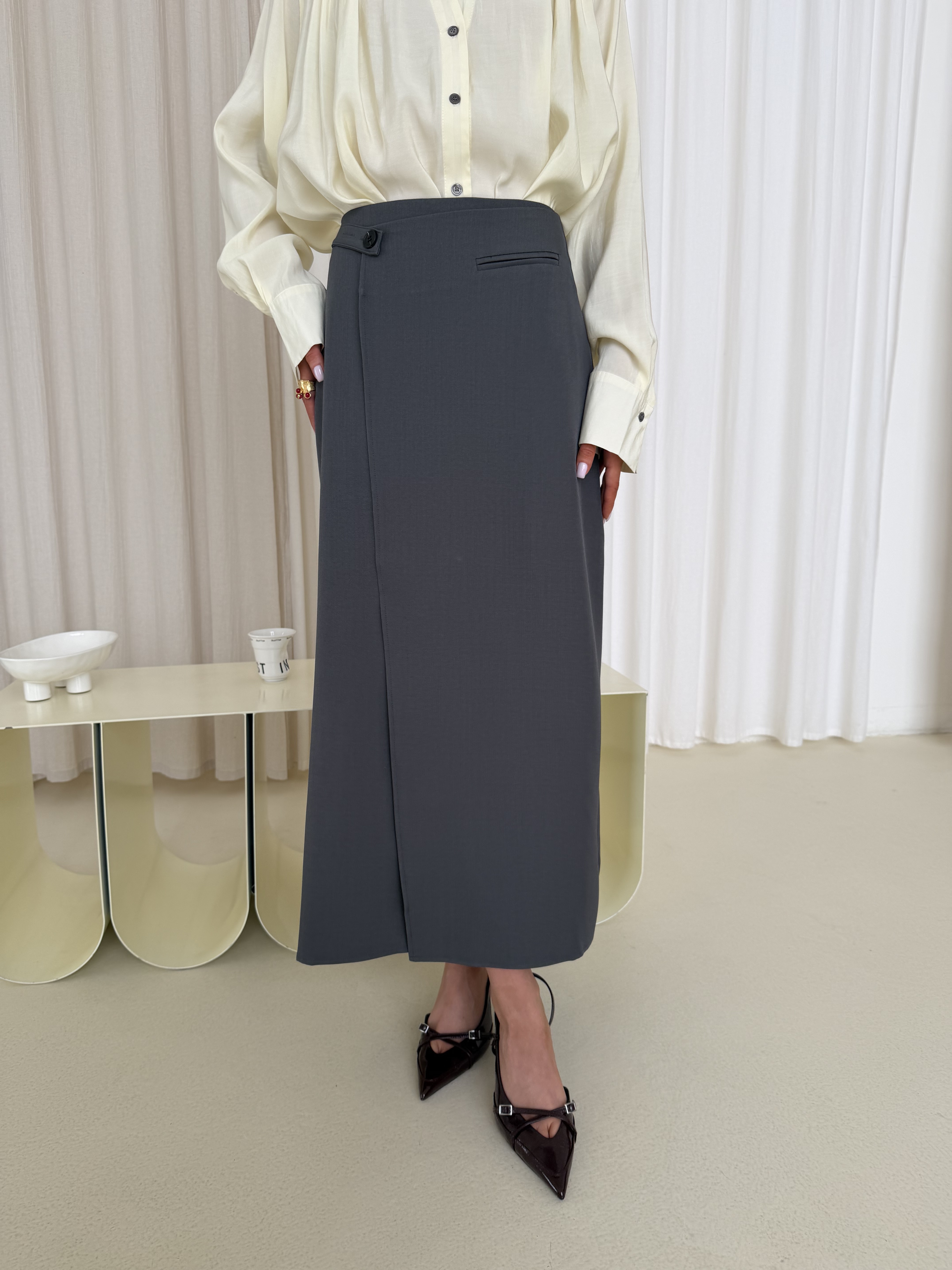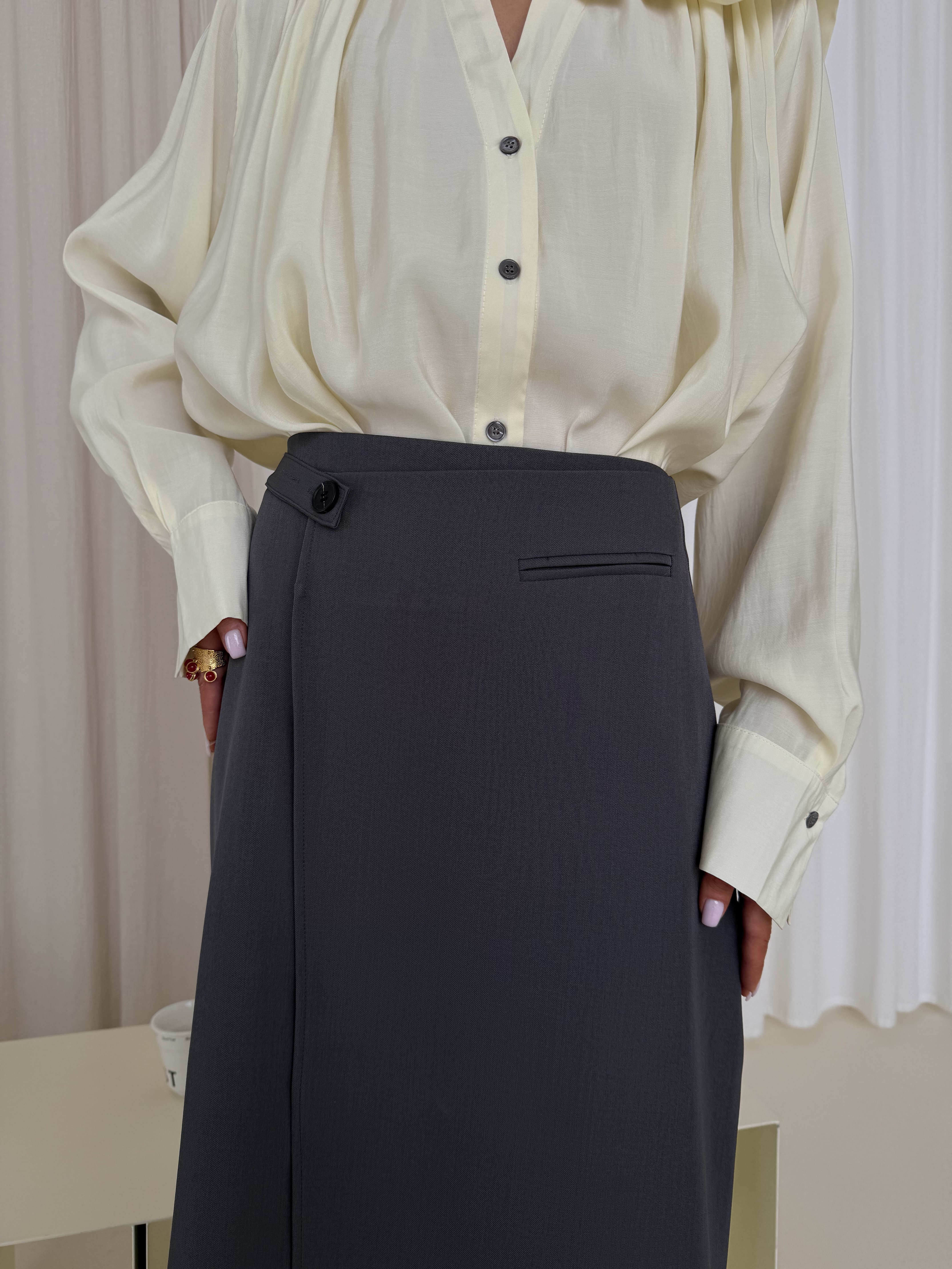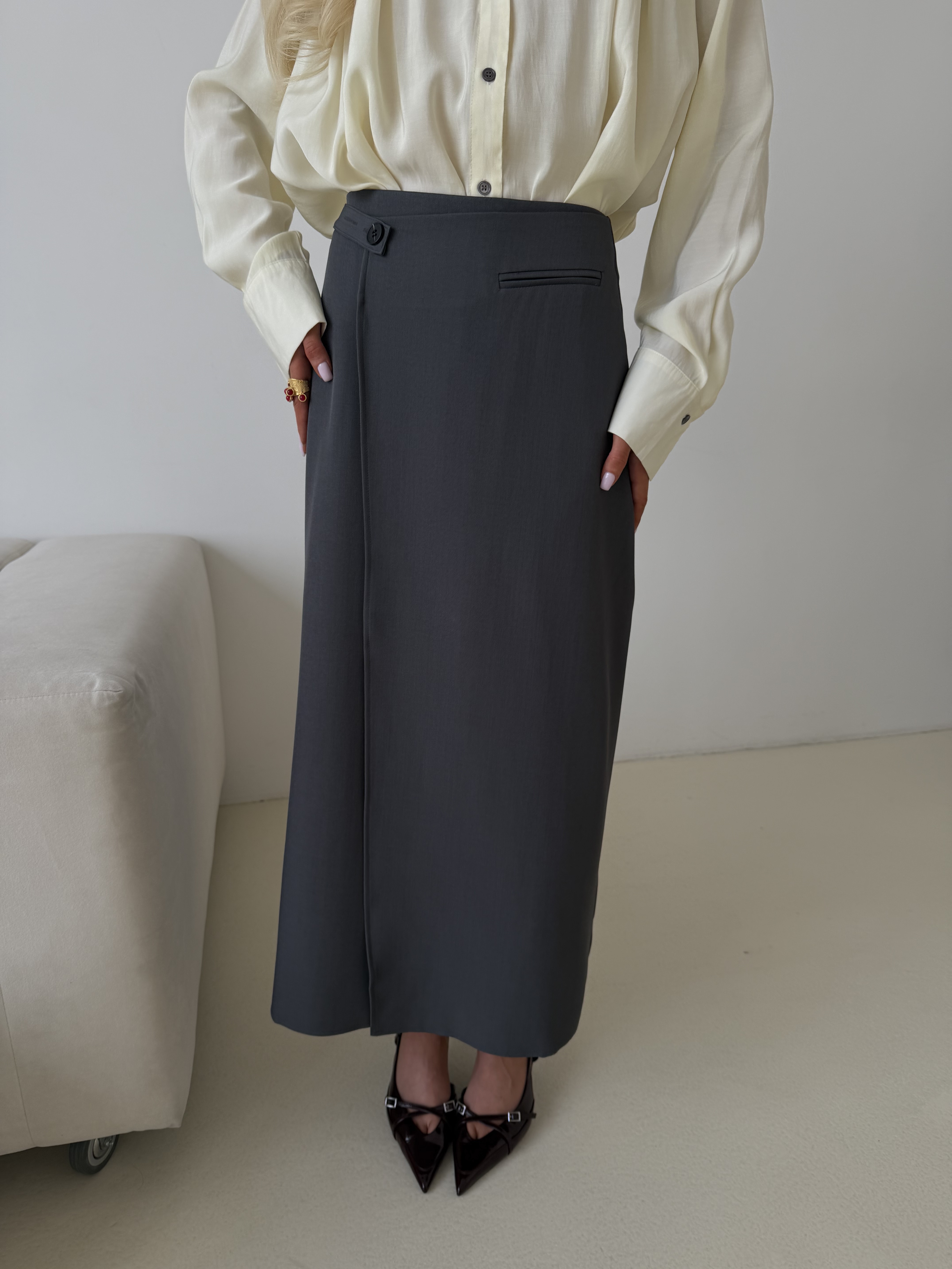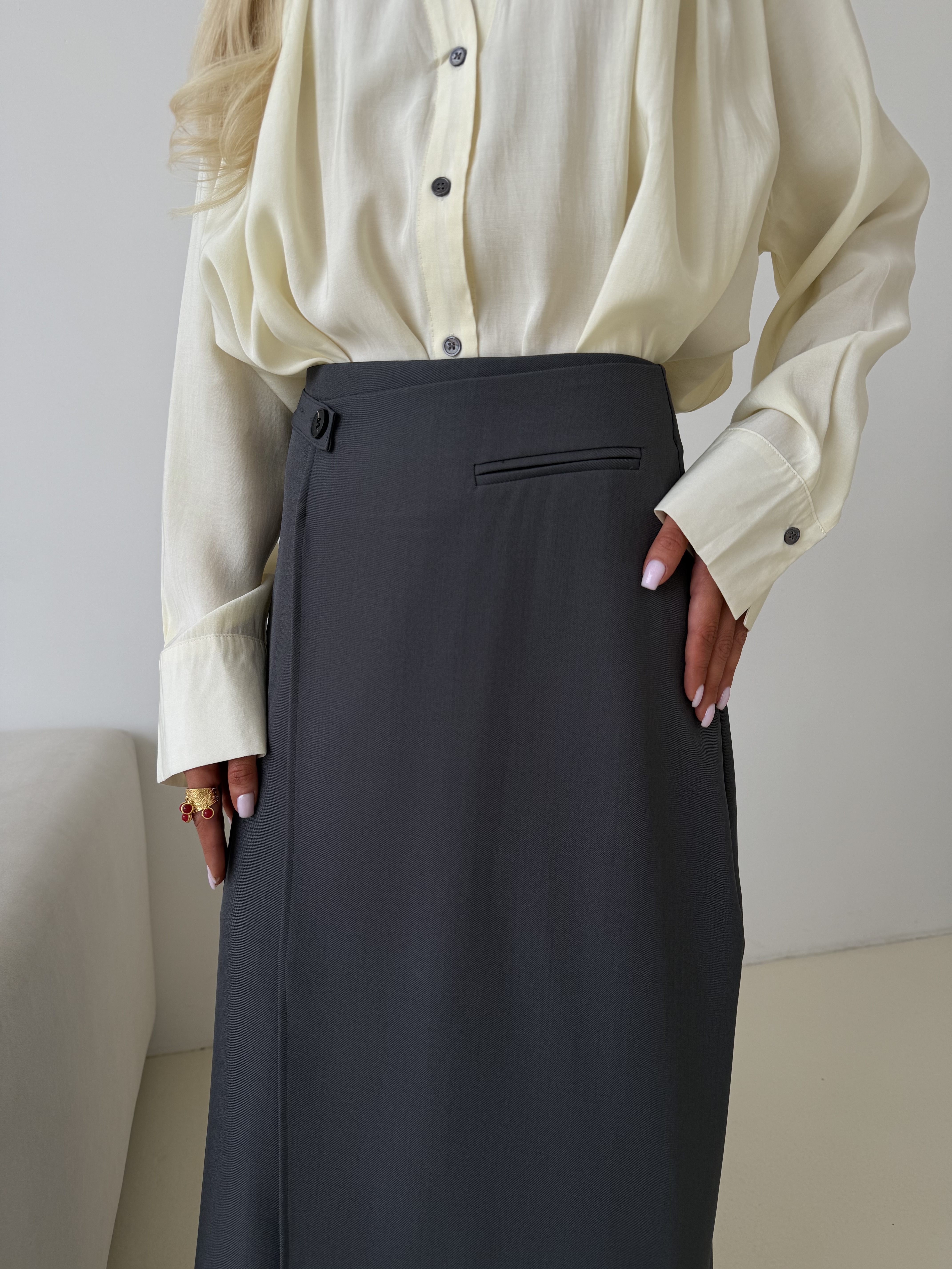 Запах придаёт модели динамику и лёгкий акцент, делая классическую форму более интересной. Такая юбка легко сочетается с базовыми топами, рубашками и жакетами, подходя как для деловых образов, так и для более вечерних сочетаний.
