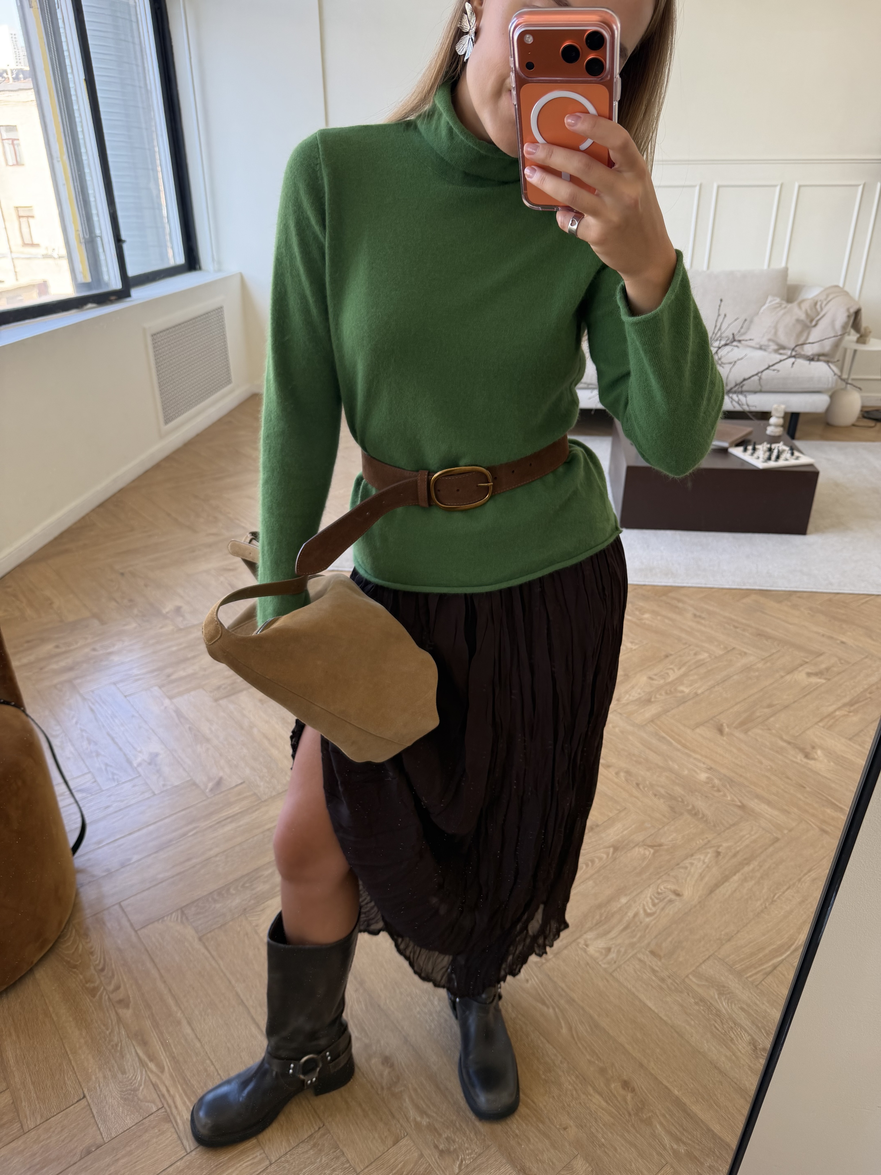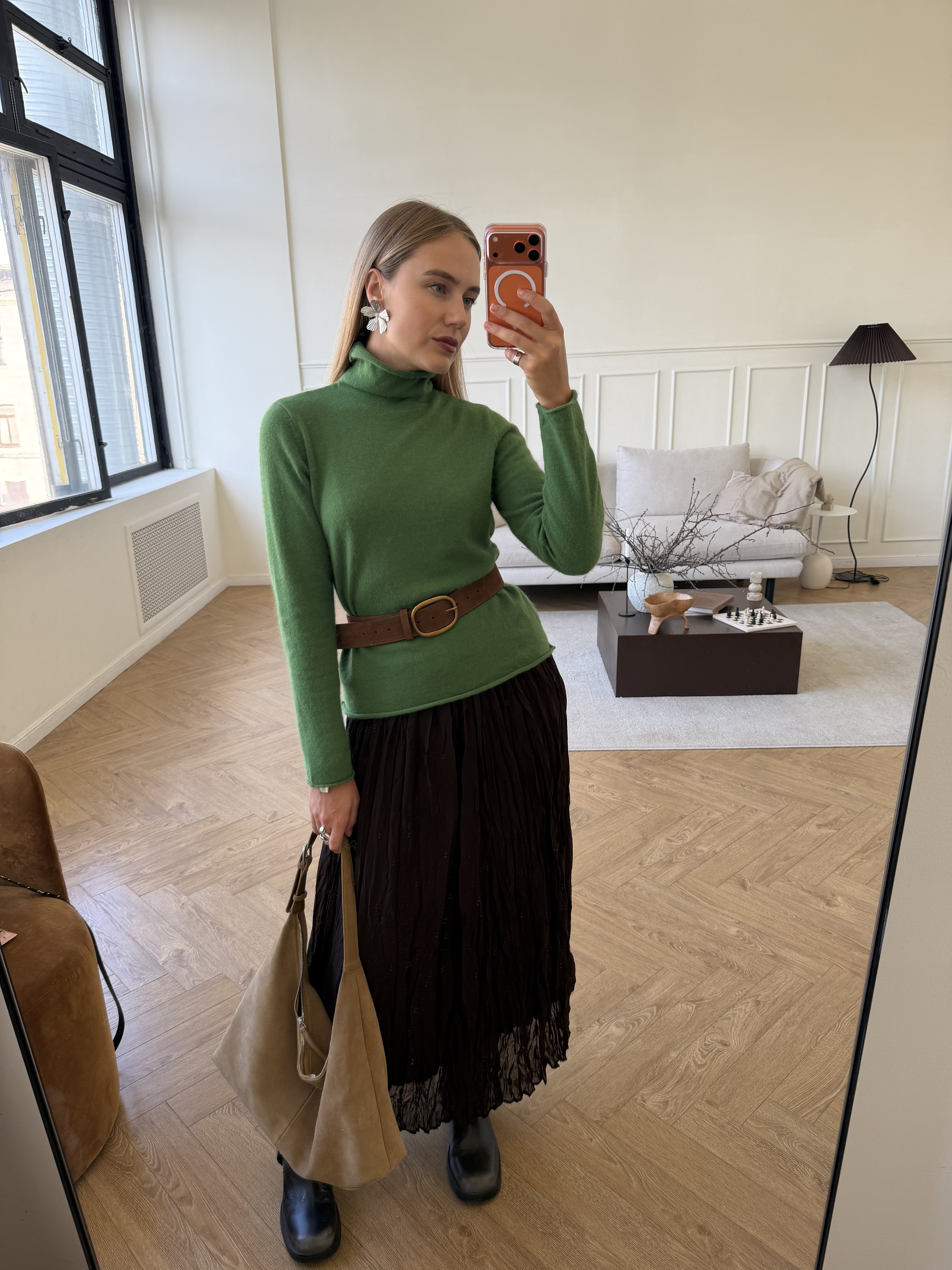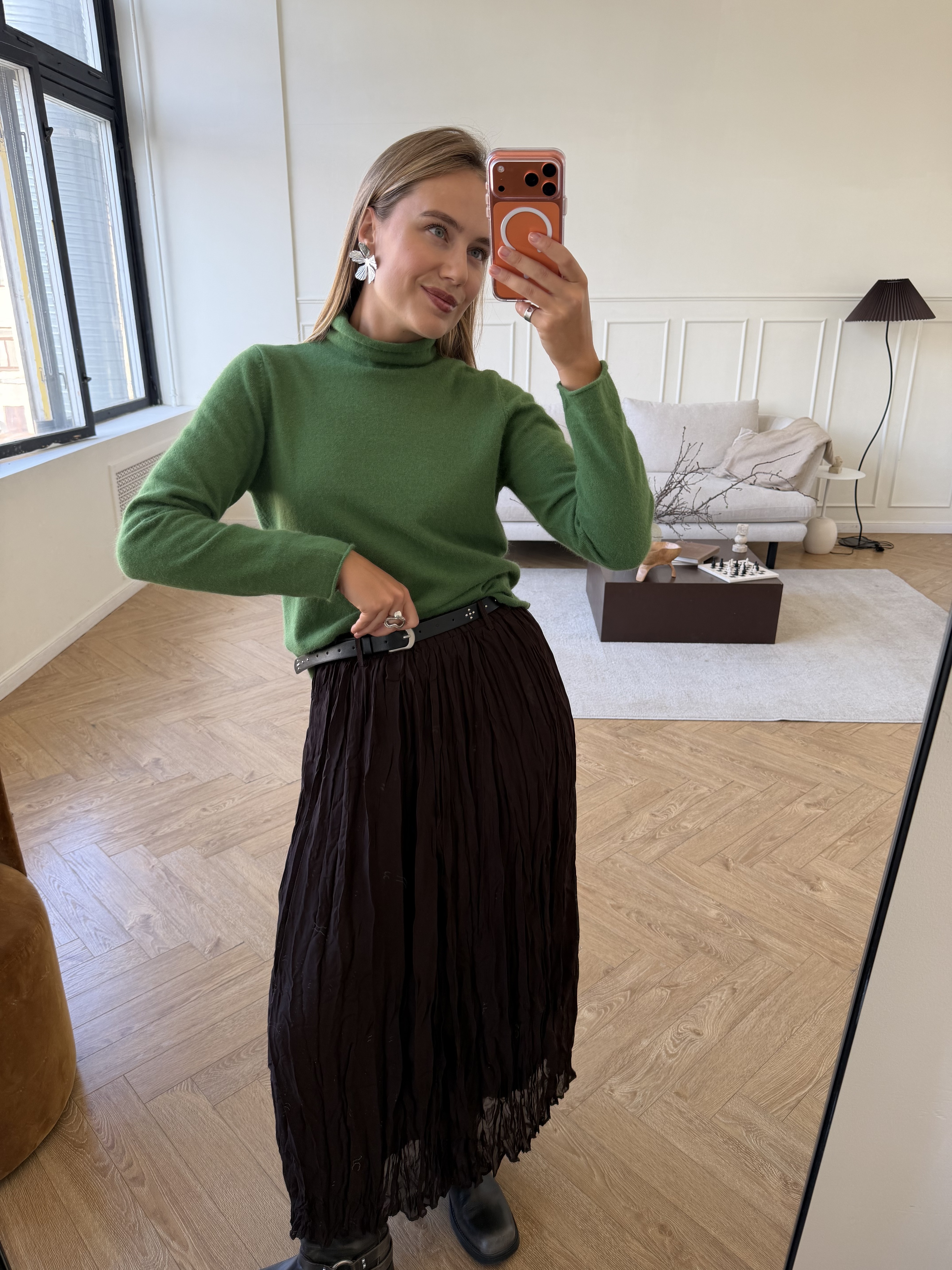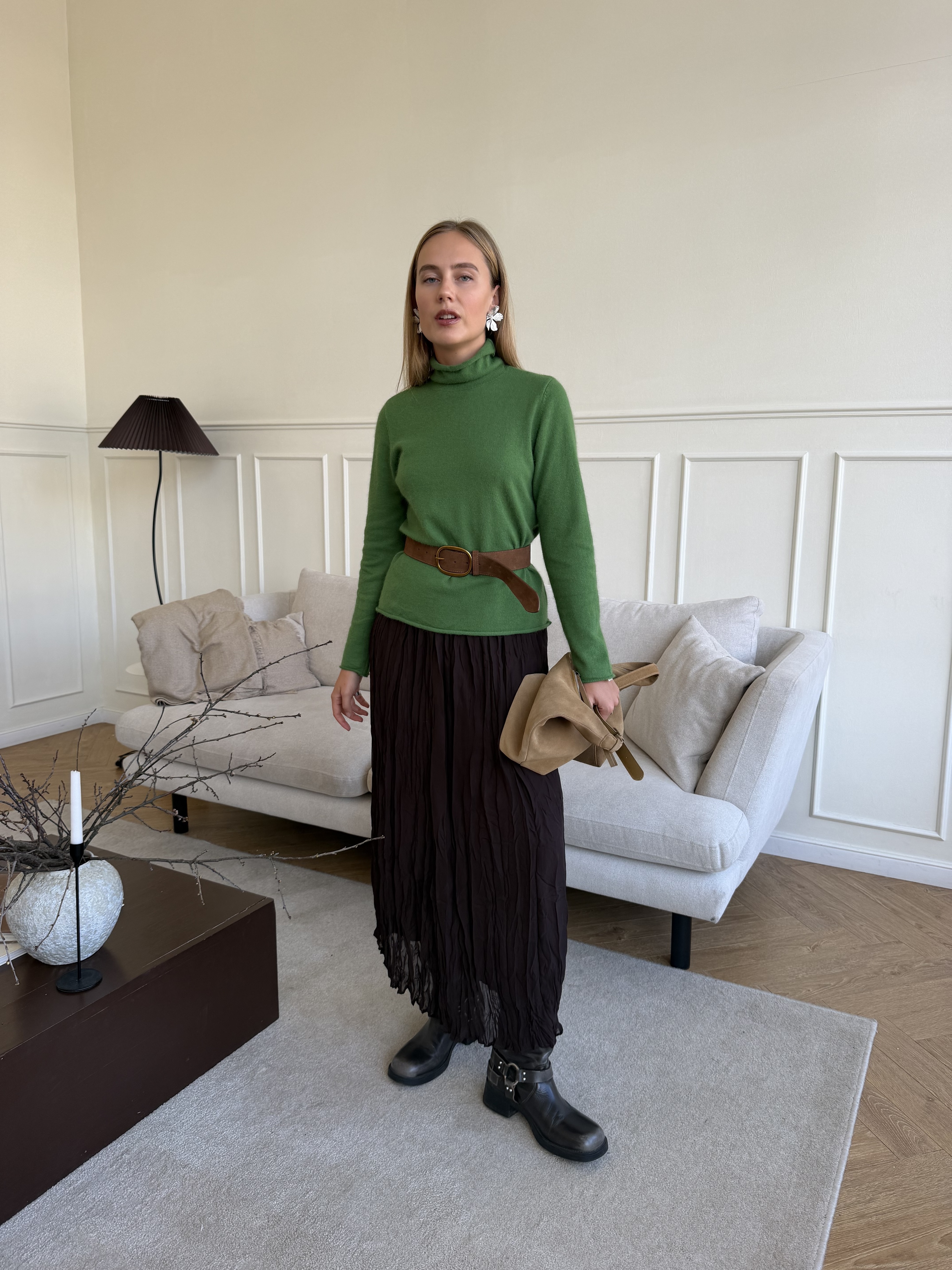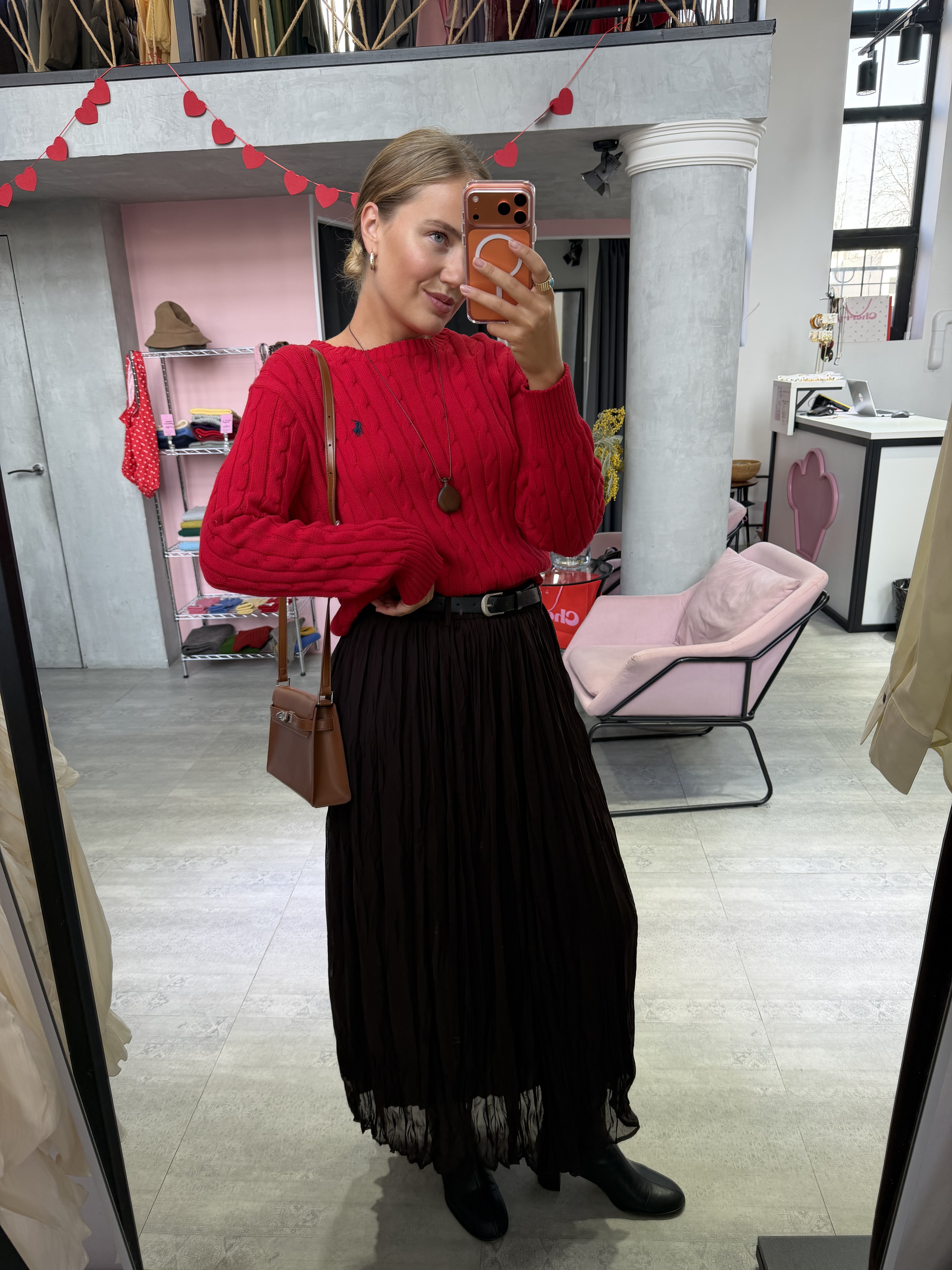 Длинная шифоновая юбка глубокого шоколадного оттенка с лёгкой жатой фактурой, которая создаёт мягкую вертикальную динамику и красиво движется при ходьбе. Модель выполнена в свободном силуэте и мягко драпируется, формируя струящийся и женственный образ.