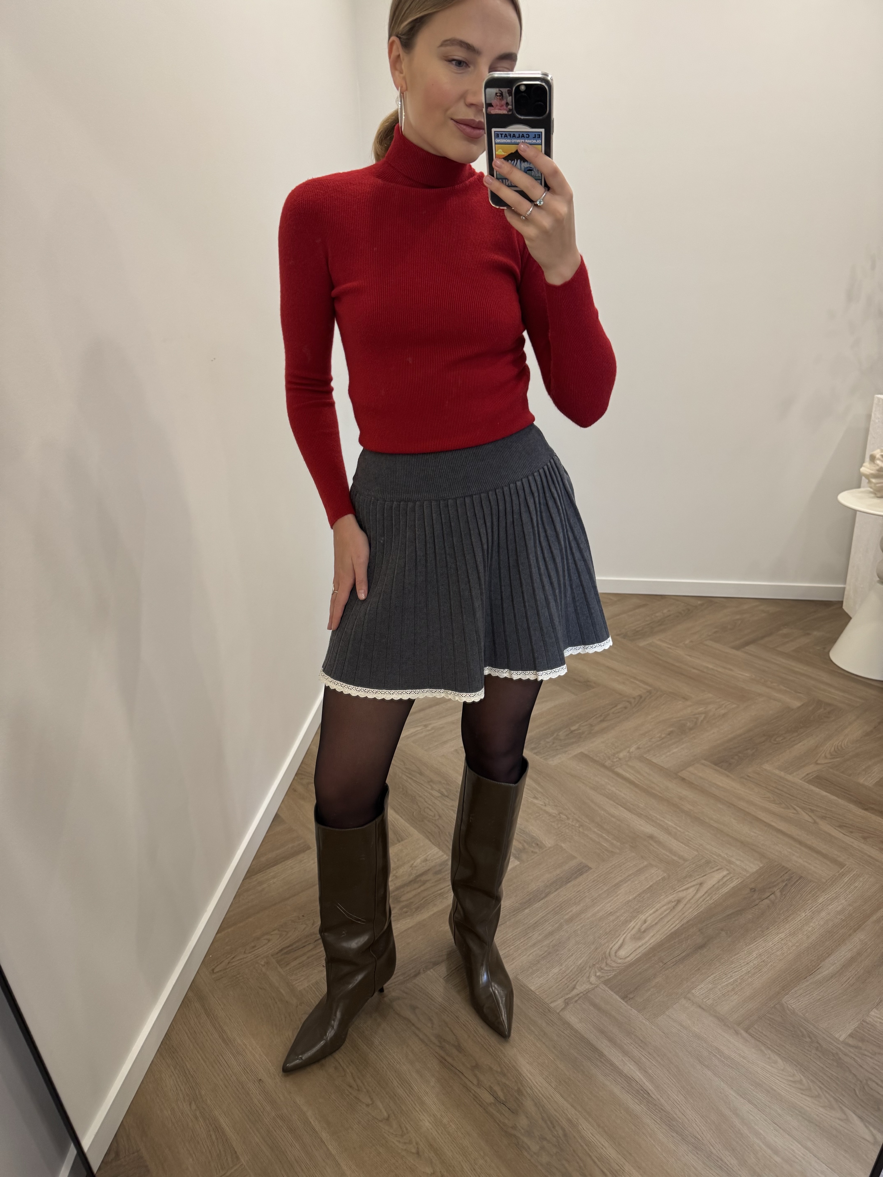 Юбка выполнена из плотного трикотажа с аккуратной, равномерной плиссировкой, которая держит форму и создаёт мягкий объём. Посадка комфортная, за счёт широкого пояса модель хорошо фиксируется на талии и подчёркивает силуэт. Длина мини выглядит игриво, но остаётся удобной для повседневной носки.