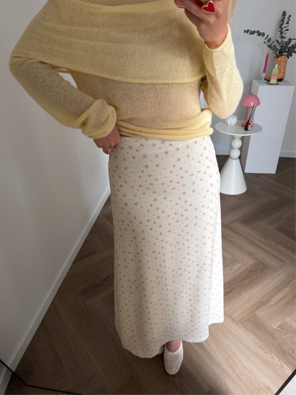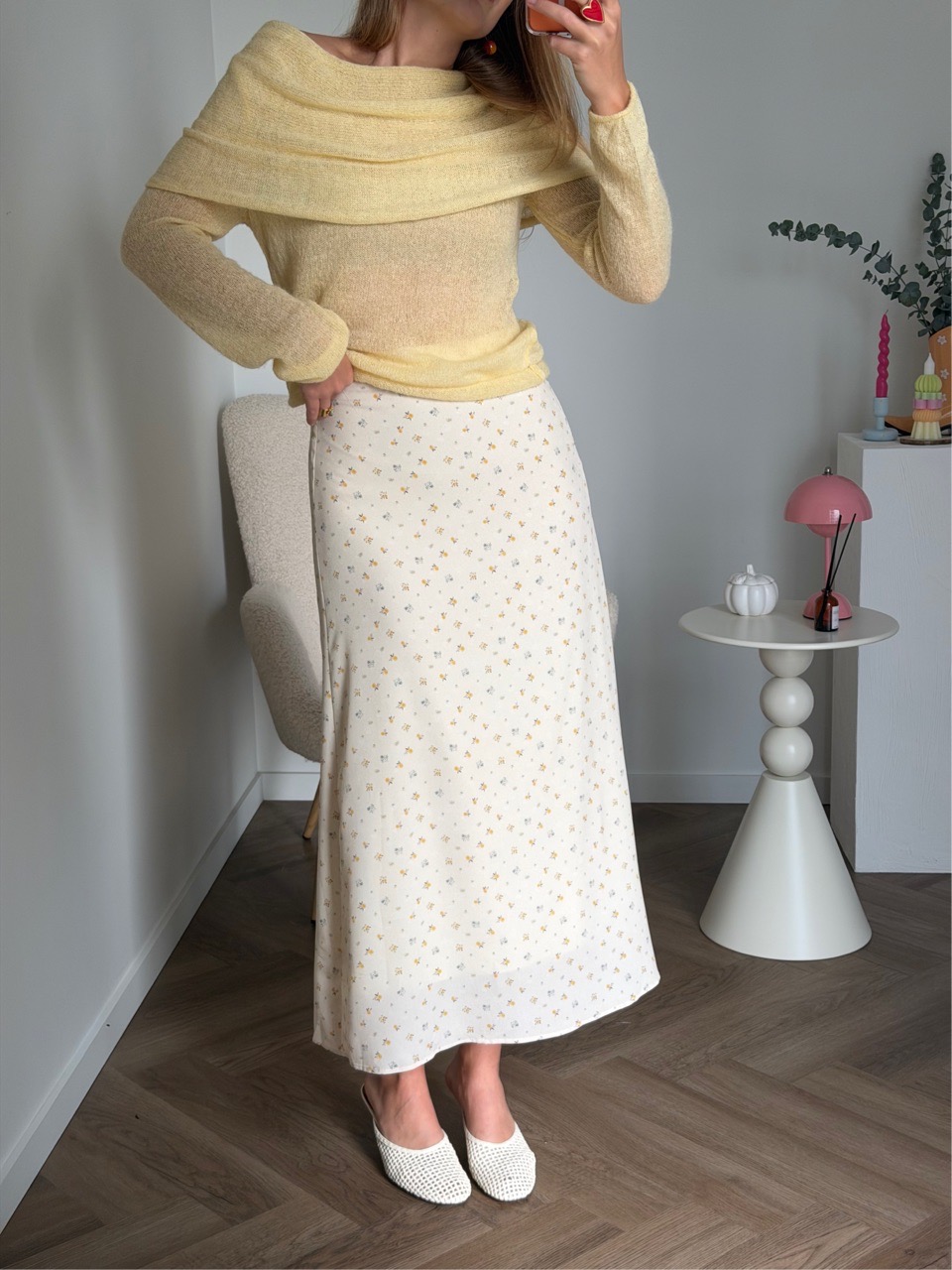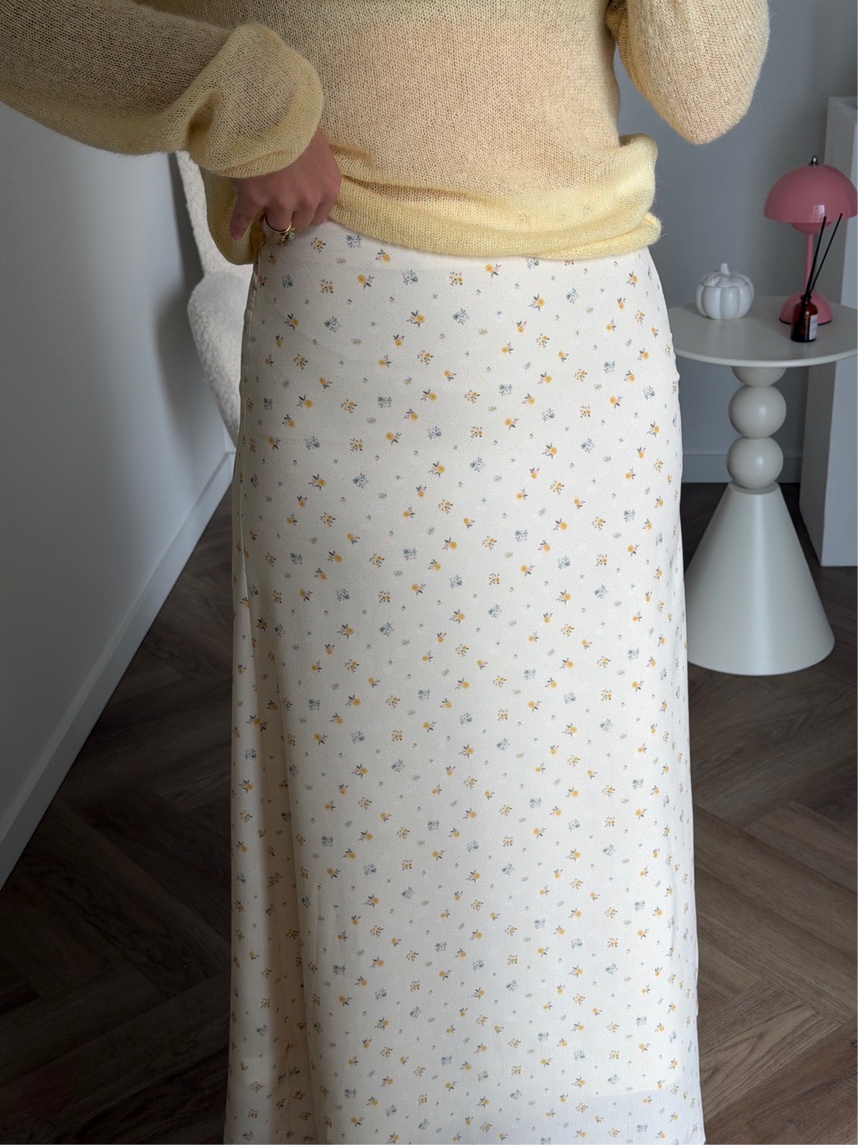 Юбка миди мягкого А-силуэта с деликатным мелким принтом и плавной посадкой по фигуре. Лёгкая струящаяся ткань красиво движется при ходьбе и делает образ утончённым и романтичным.