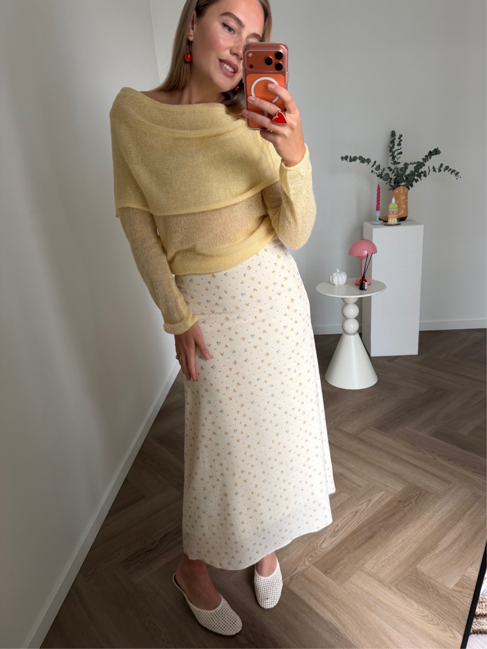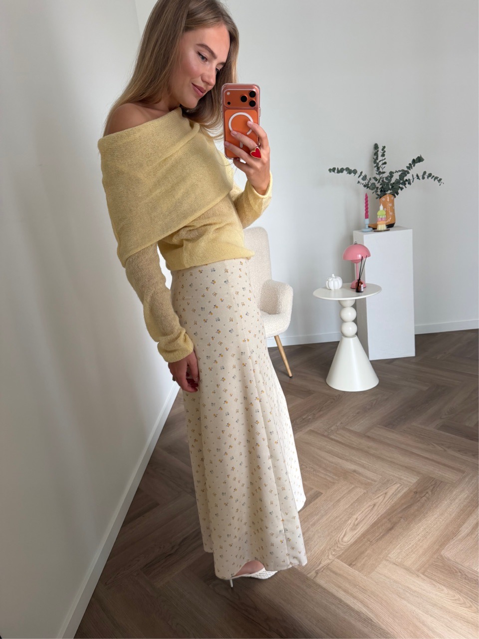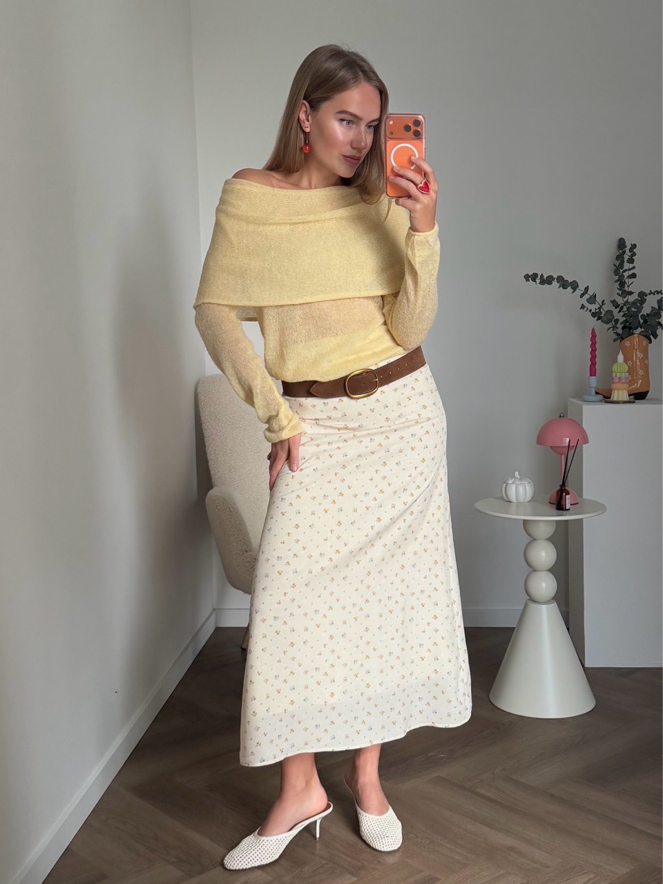 Юбка миди мягкого А-силуэта с деликатным мелким принтом и плавной посадкой по фигуре. Лёгкая струящаяся ткань красиво движется при ходьбе и делает образ утончённым и романтичным.