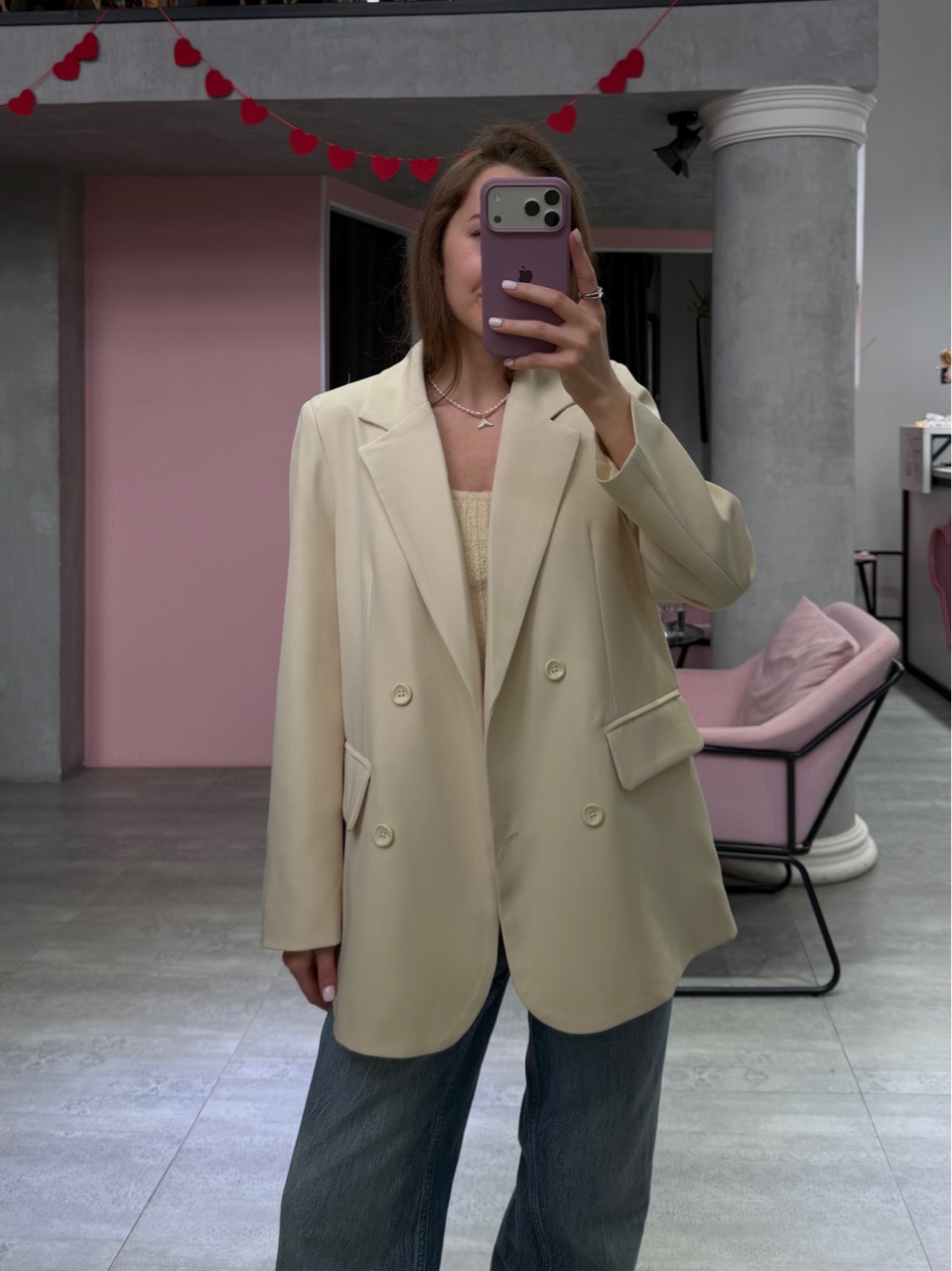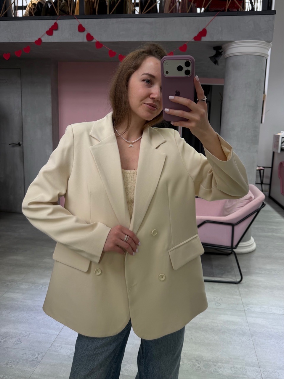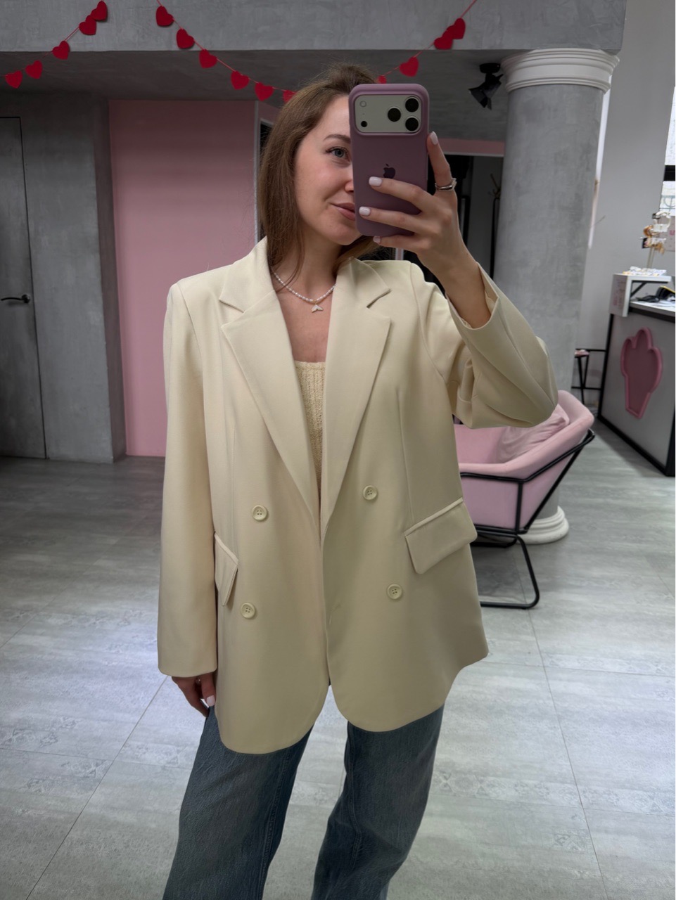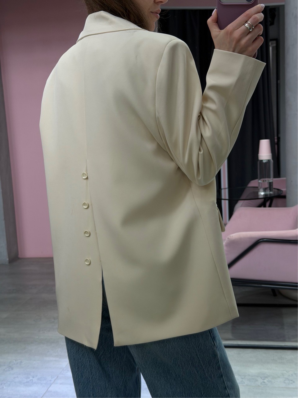 Удлинённый двубортный жакет свободного кроя с чёткой линией плеч и лаконичным силуэтом, который легко вписывается как в повседневный, так и в более собранный гардероб. Акцентная деталь модели — декоративный ряд пуговиц на спинке, добавляющий классическому фасону современное звучание. Плотная ткань хорошо держит форму, создавая аккуратную посадку.
