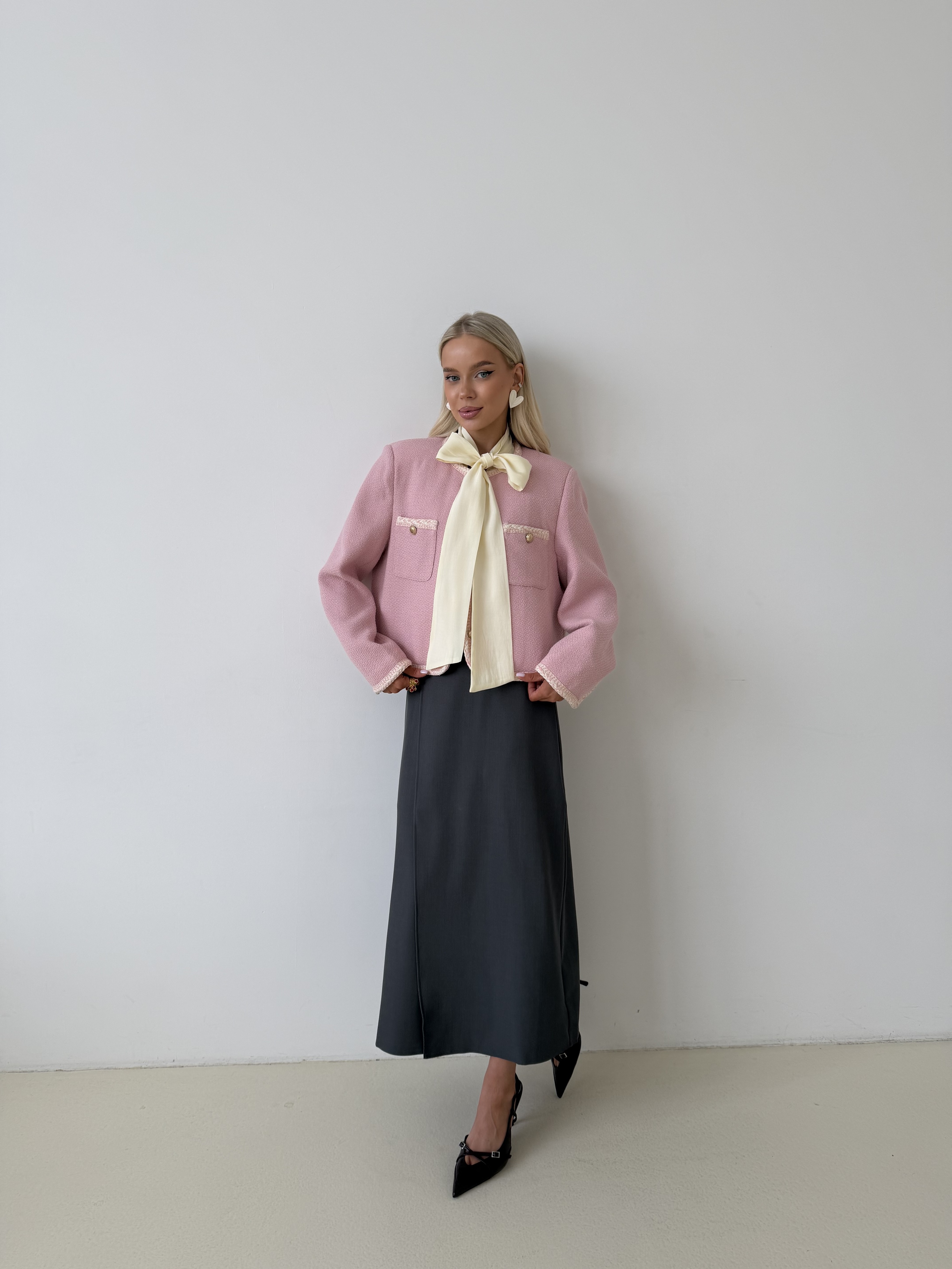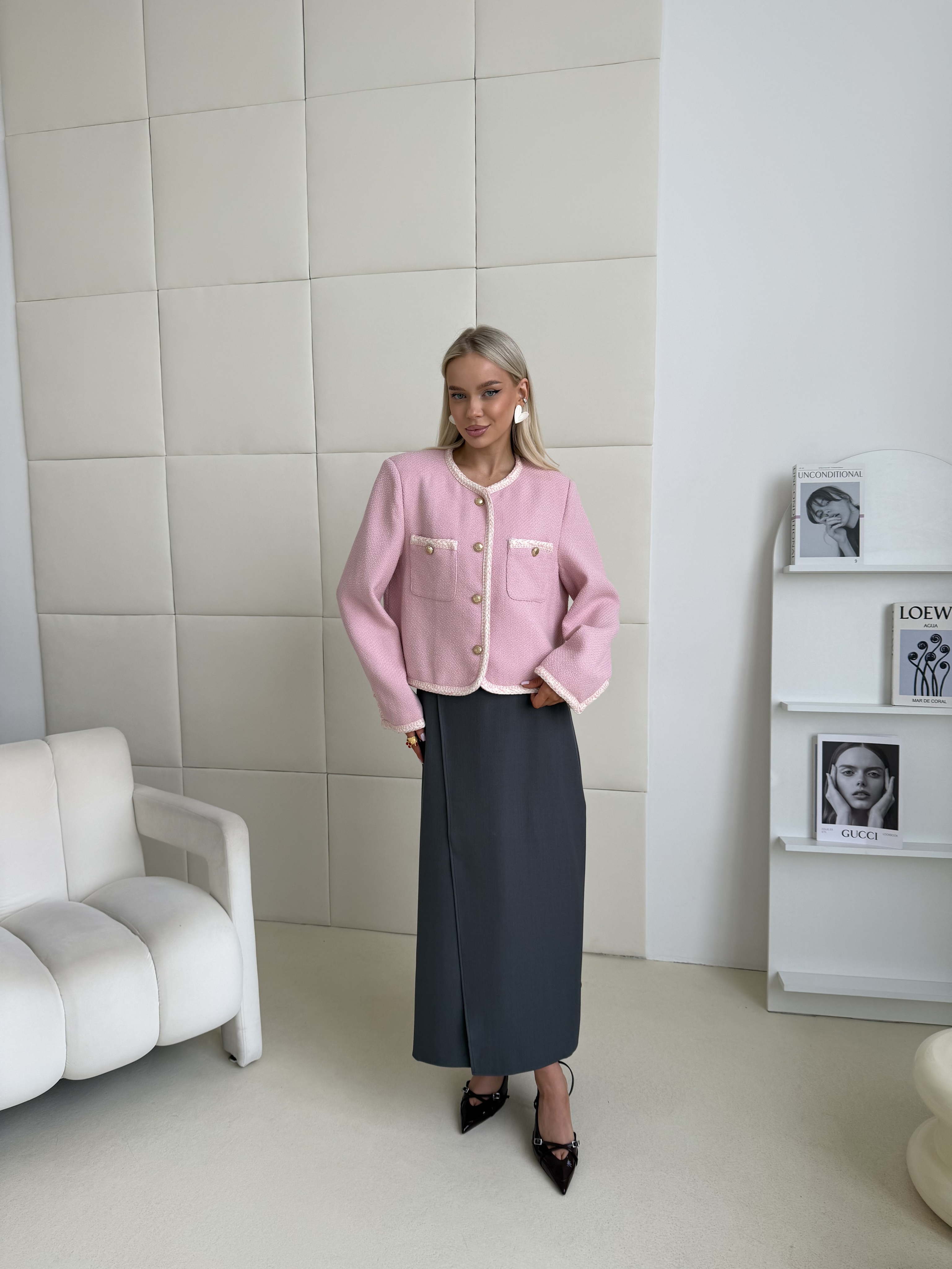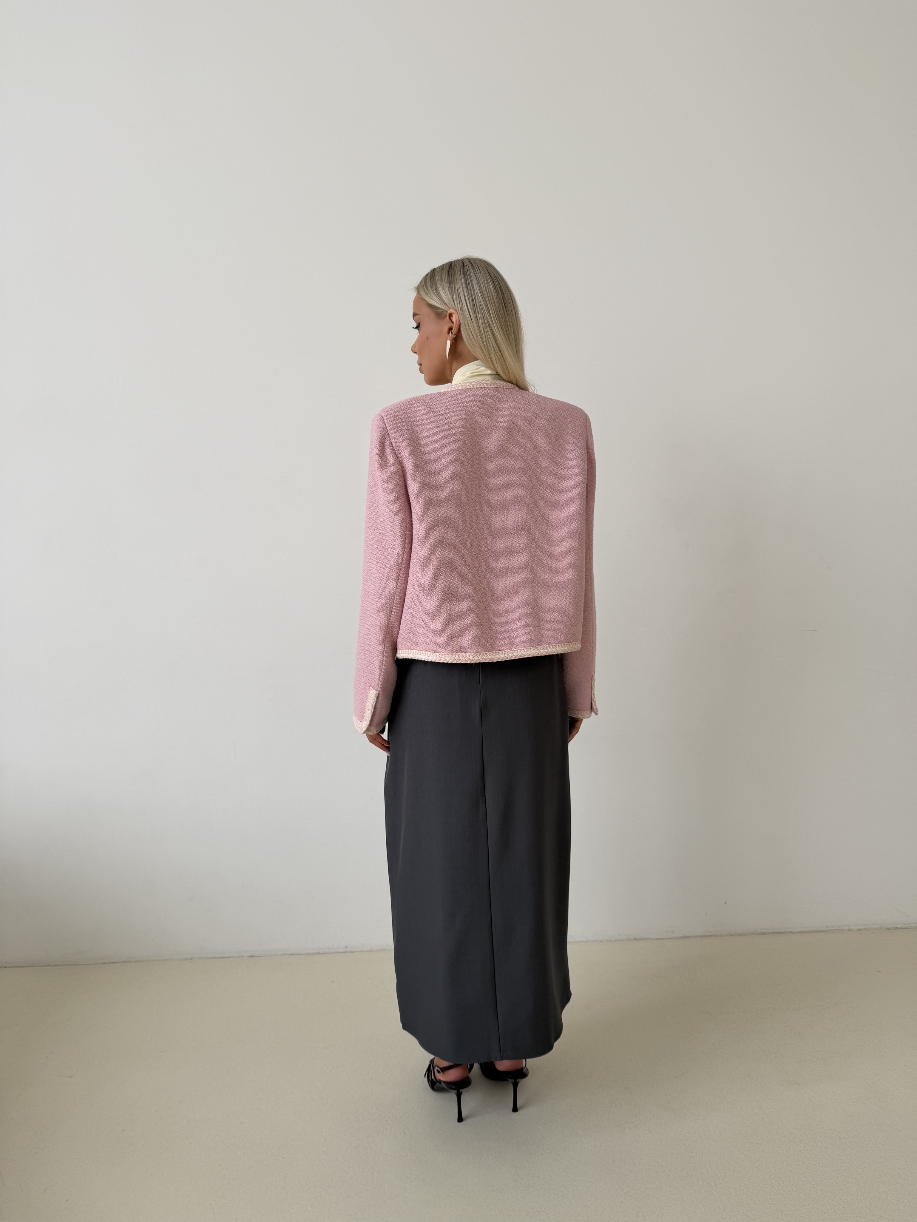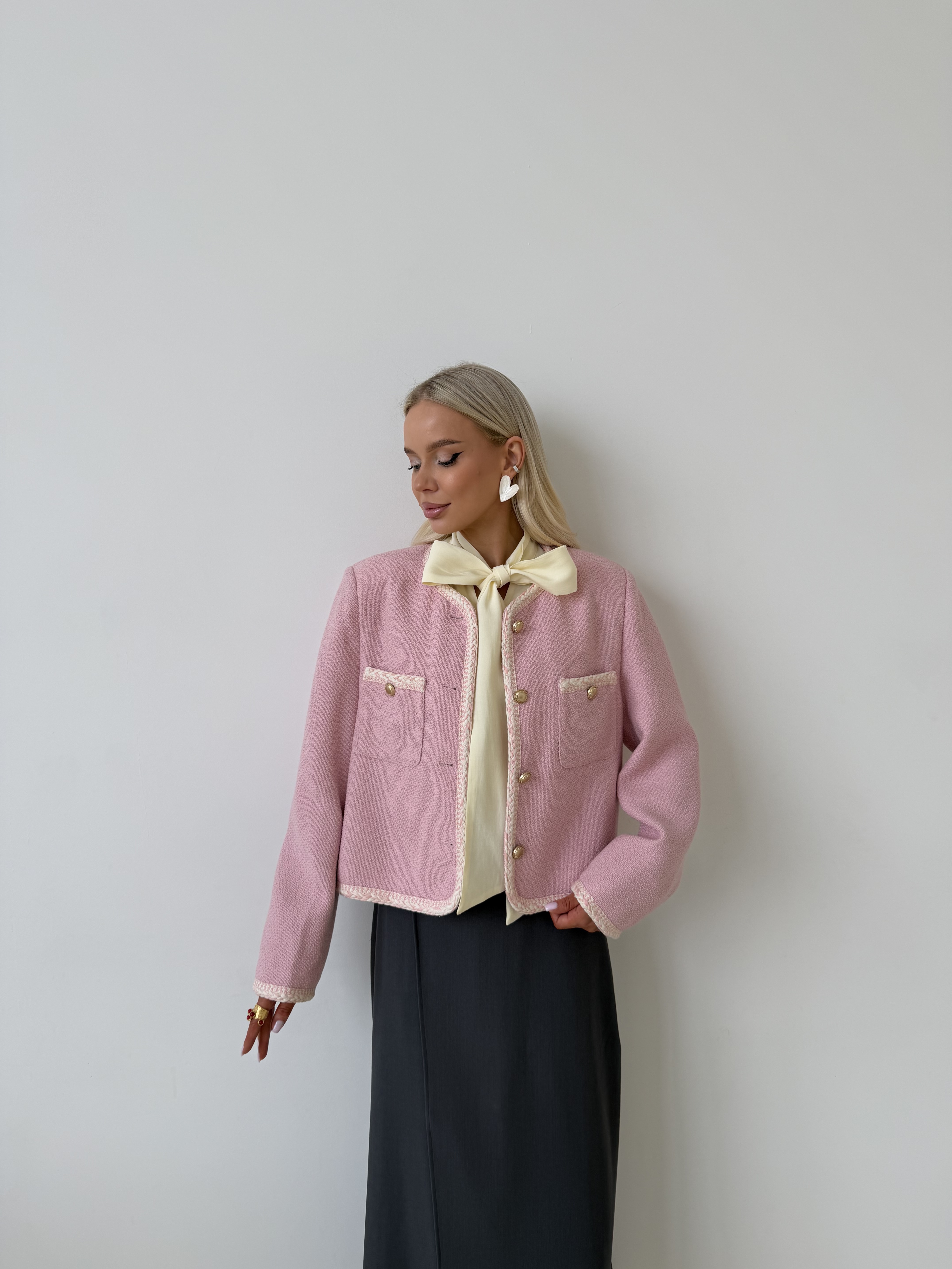Твидовый жакет в нежно-розовом оттенке — выразительная модель с акцентом на деталях. Фактурная ткань придаёт образу глубину и лёгкий французский шарм, сохраняя при этом аккуратный и структурированный силуэт.